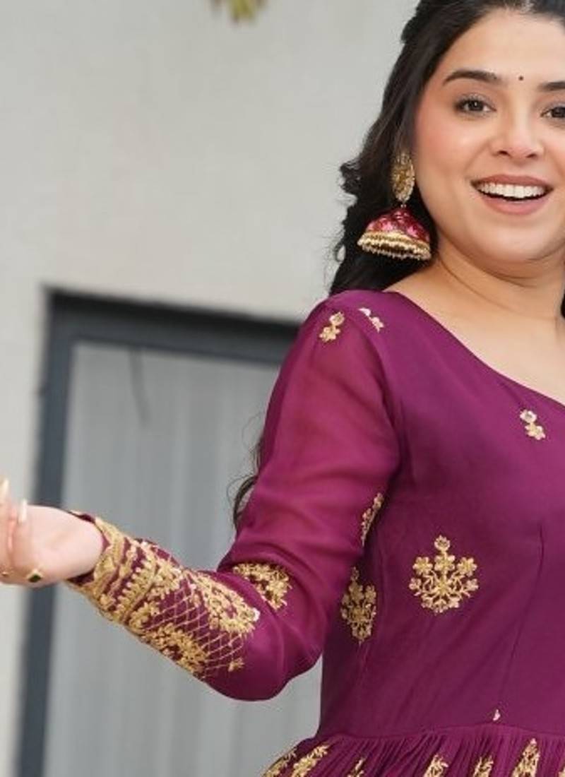 Wine star georgette heavy zari sequins embroidered gown stitched