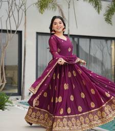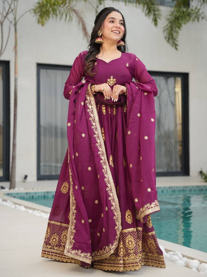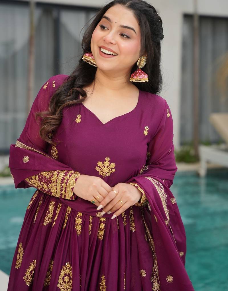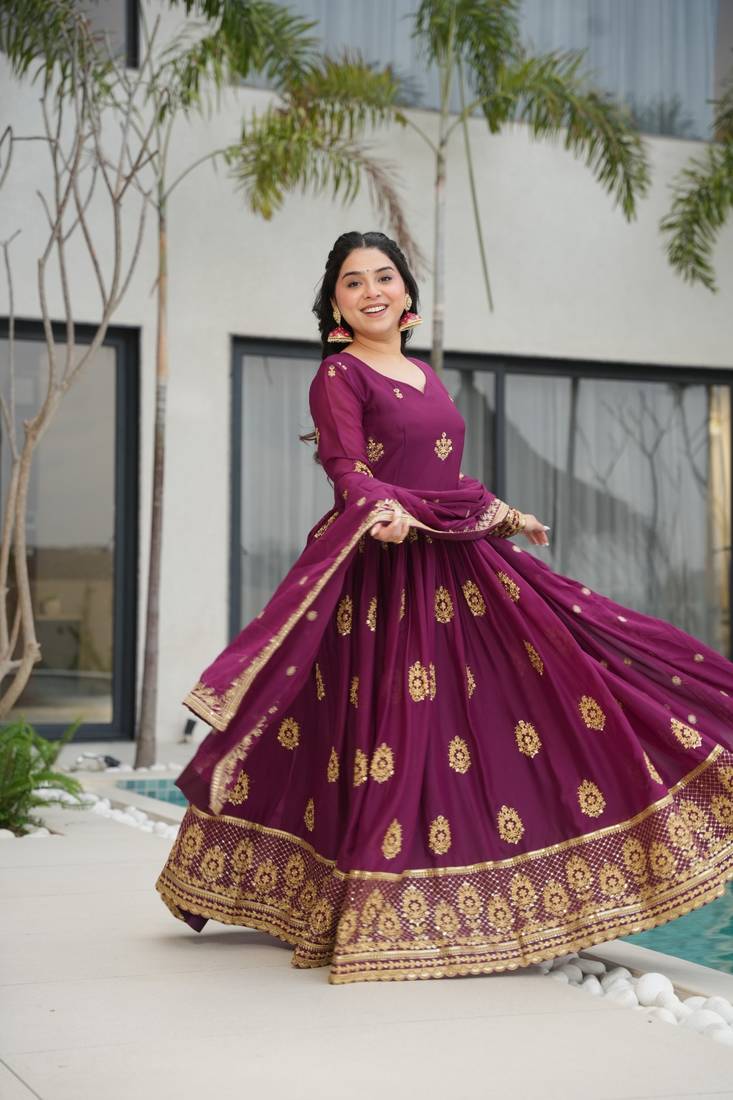 | Product Description | Introducing A Luxurious Wine Star Georgette Designer Gown, Crafted With Rich Zari And Sequins Embroidery For A Premium Festive And Wedding Wear Appeal.