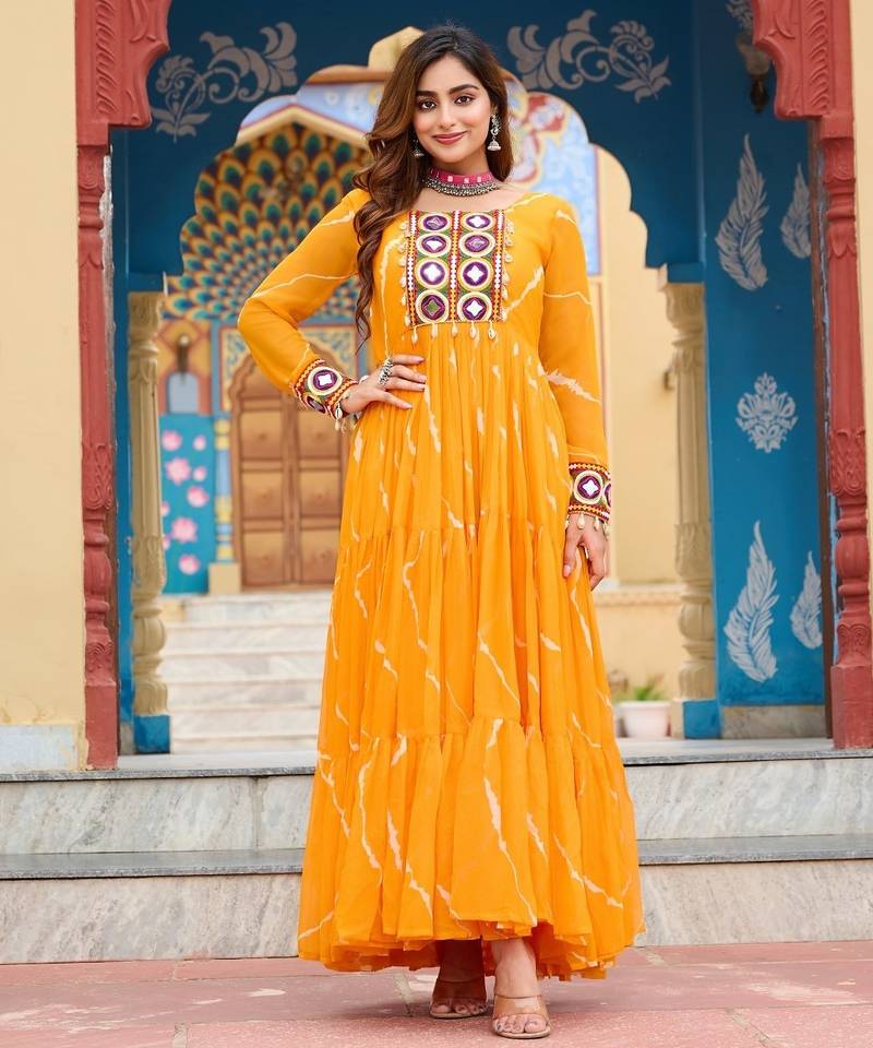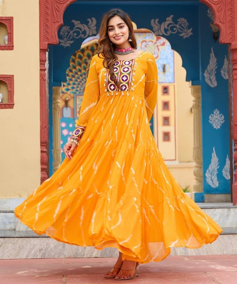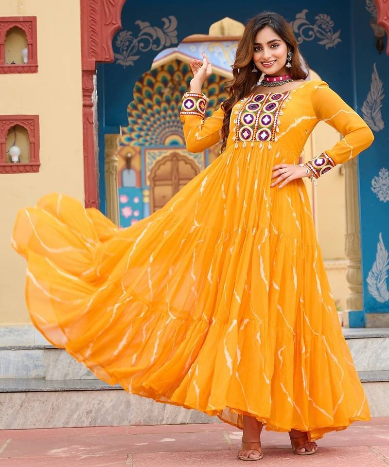 | Product Description | Brighten Up Your Festive Wardrobe With This Stunning Yellow Faux Georgette Kutchi Patchwork Gown, Designed With Intricate And Colorful Patchwork Inspired By Traditional Kutchi Artistry. The Vibrant Detailing Adds Cultural Richness, Making It Perfect For Navratri, Festive Celebrations, Cultural Programs, And Traditional Events. Crafted From Soft Faux Georgette, The Gown Offers A Smooth Drape, Lightweight Feel, And All Day Comfort. The Semi Stitched Design (Up To Size 42) Allows Easy Customization For A Perfect Personal Fit. The Cheerful Yellow Tone Enhances Its Festive Charm, Giving You A Stylish, Ethnic, And Elegant Look. |