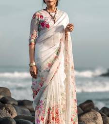 White printed pure cotton white saree with blouse