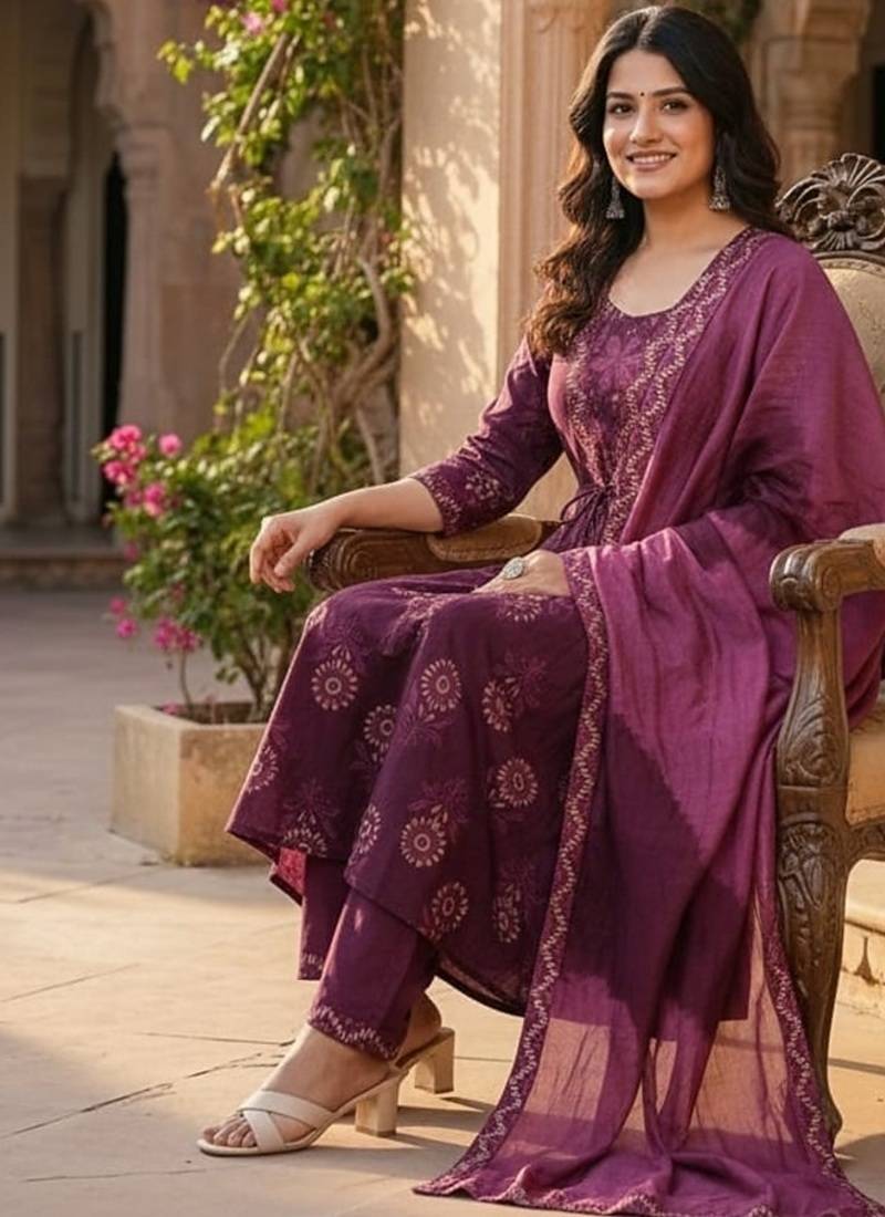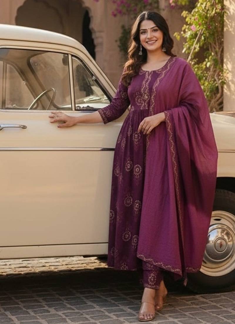 This Suit Features A Purple Anarkali Kurta Set With Pants And A Dupatta, A Traditional Indian Ethnic Outfit In Printed Design. Two Layer Style Anarkali Kurti With Pant & Dupatta In Azrakha Print Bagru Dye