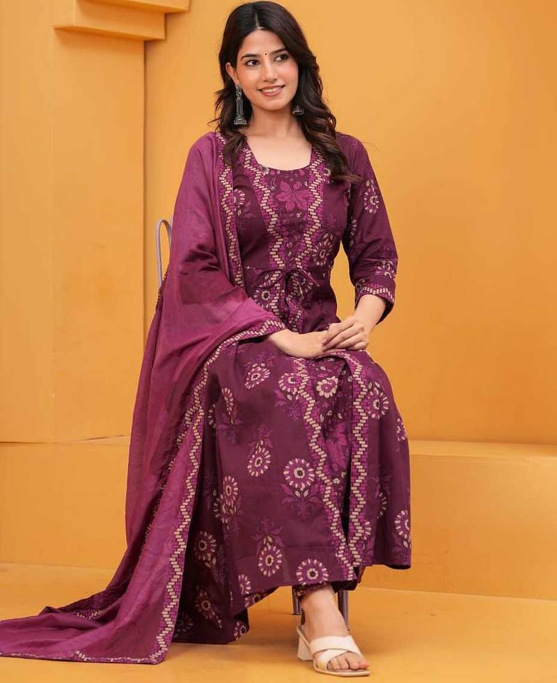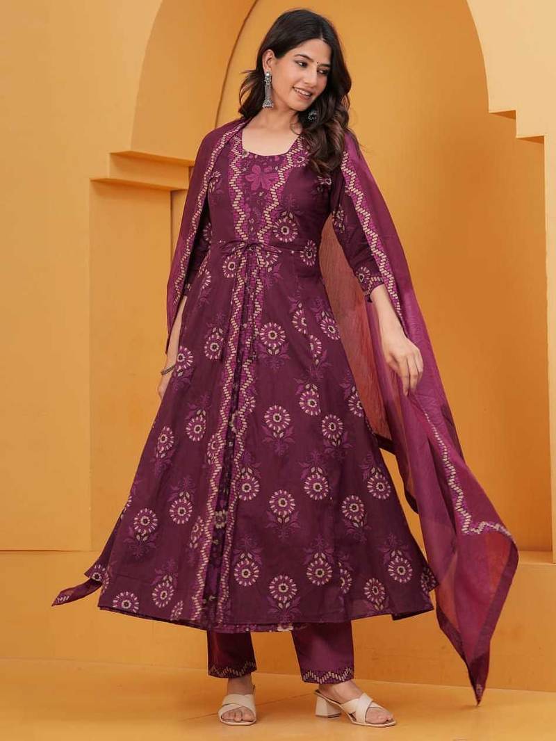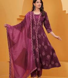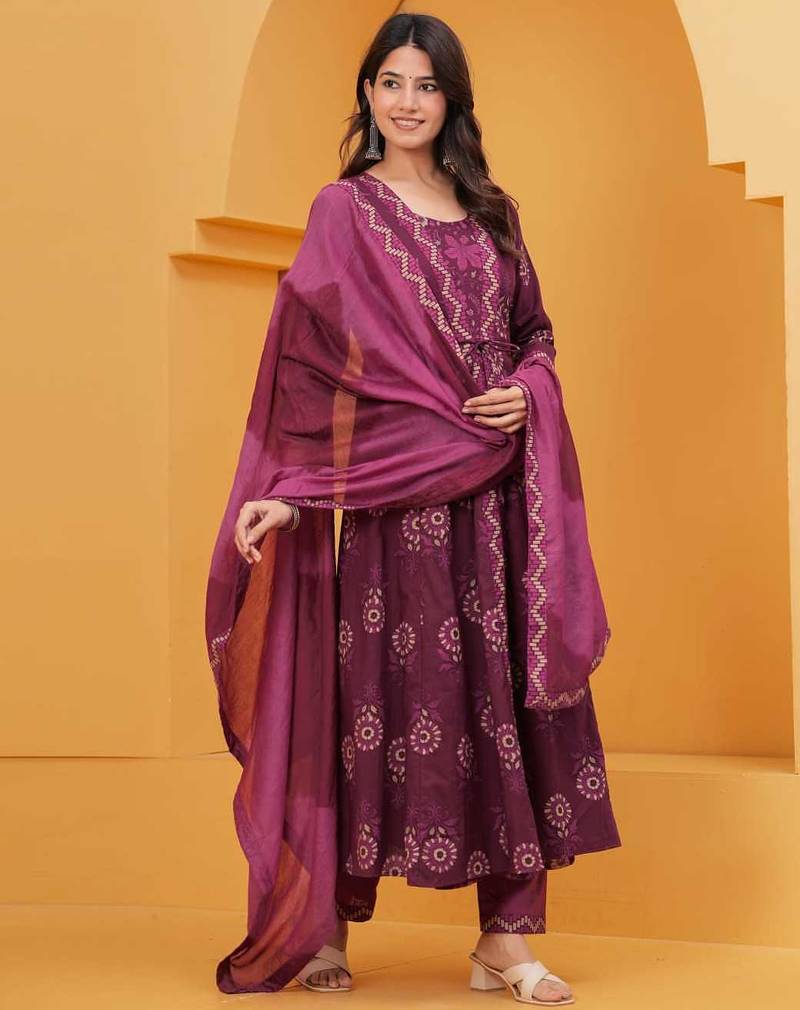 | Product Description | This Suit Features A Raspberry Anarkali Kurta Set With Pants And A Dupatta, A Traditional Indian Ethnic Outfit In Printed Design. Two Layer Style Anarkali Kurti With Pant & Dupatta In Azrakha Print Bagru Dye |