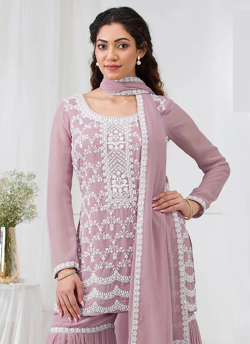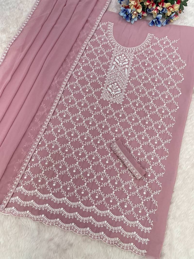 Pink faux georgette with heavy embroidery cotton thread work unstitched suit