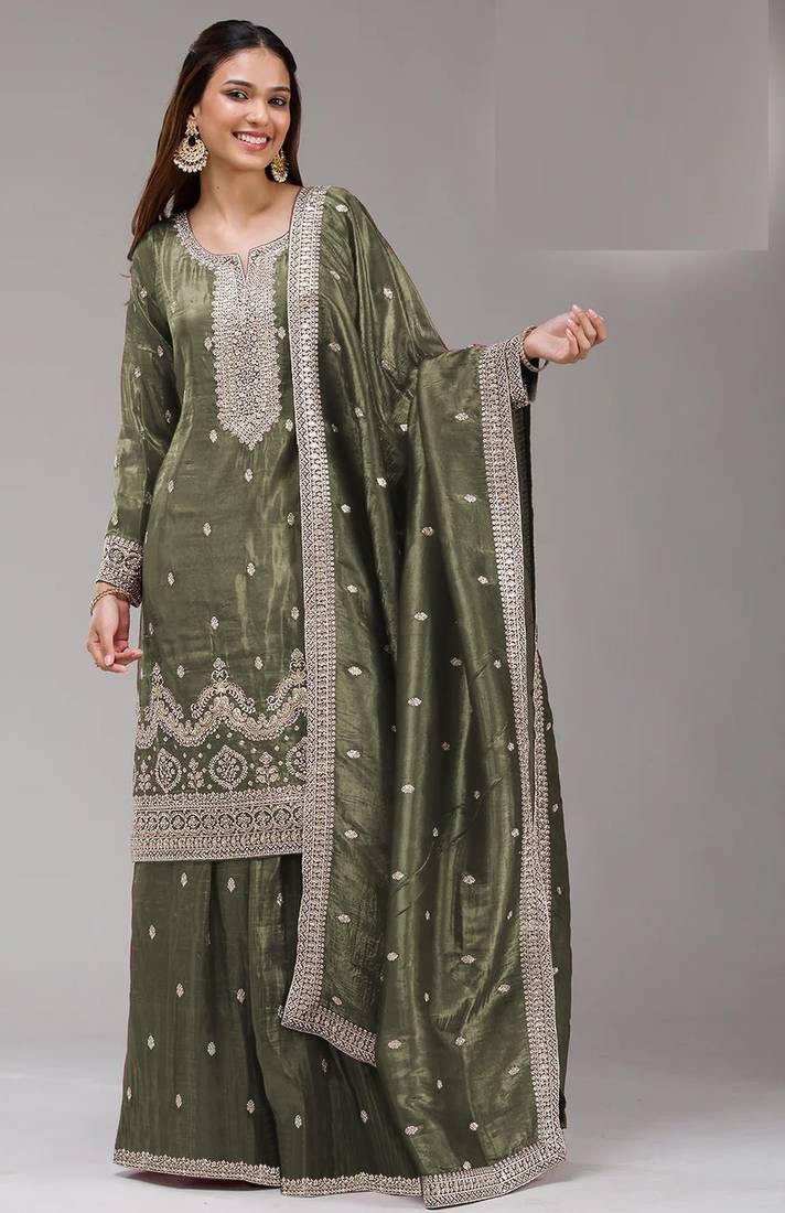 Green embroidered gold crush semi-stitched palazzo style salwar suit