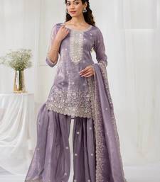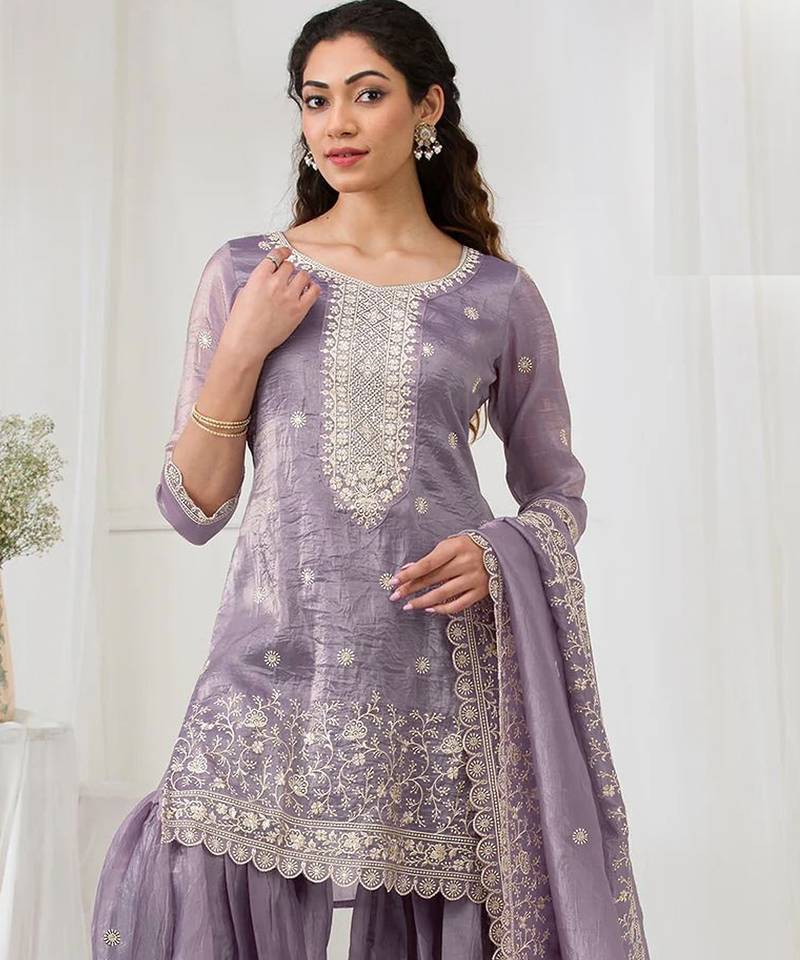 Purple embroidered gold crush semi-stitched palazzo style salwar suit