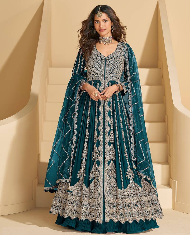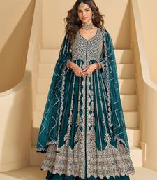 Teal embroidered chinon anarkali salwar suit semi stitched