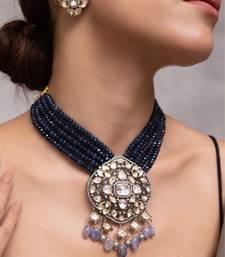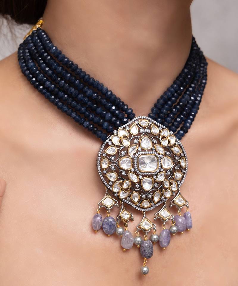 Bold And Majestic, This Navy Beaded Choker Centers Around An Oversized Floral Kundan Pendant With Pastel Accents. A Head Turning Choice For Brides Looking For Something Unconventional Yet Regal.