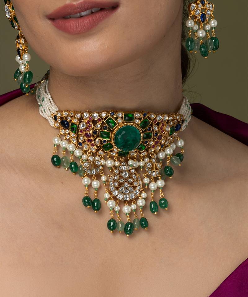 | Product Description | Adorn Yourself In Royal Splendor. This Exquisite Choker Necklace Set Features A Vibrant Mosaic Of Hand Painted Meenakari, Lustrous Kundan Gems, And Cascading Emerald Droplets. A True Celebration Of Heritage Artistry.