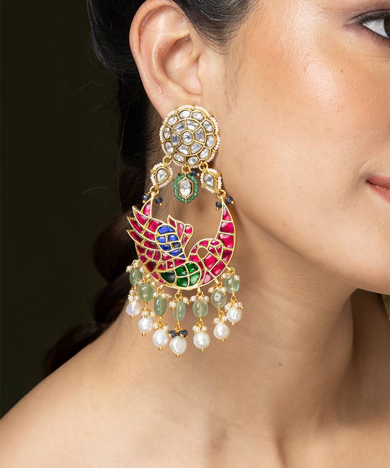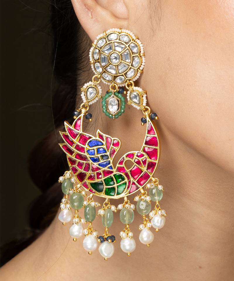 | Product Description | These Vibrant Dangler Earrings Feature Enamel Peacocks In Pink And Blue, Framed By Uncut Clear Stones And Finished With Delicate Green Bead Drops. A Spectacular And Artistic Choice For Gifting Purposes.