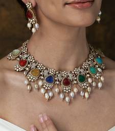 | Product Description | A Vibrant Necklace Set Showcasing Ornate Floral Motifs Set With Brightly Colored Stones—Red, Yellow, Blue, And Green—Accented With Small Hanging Pearl Drops. This Festive Piece Is Excellent For A Memorable Gift.