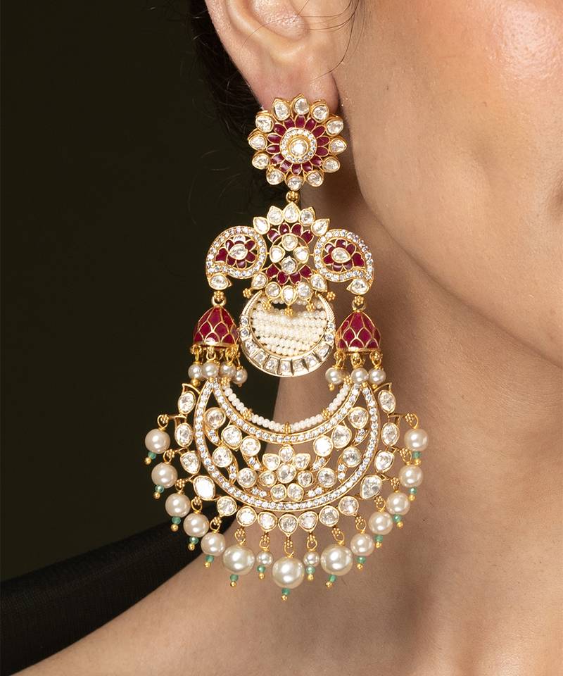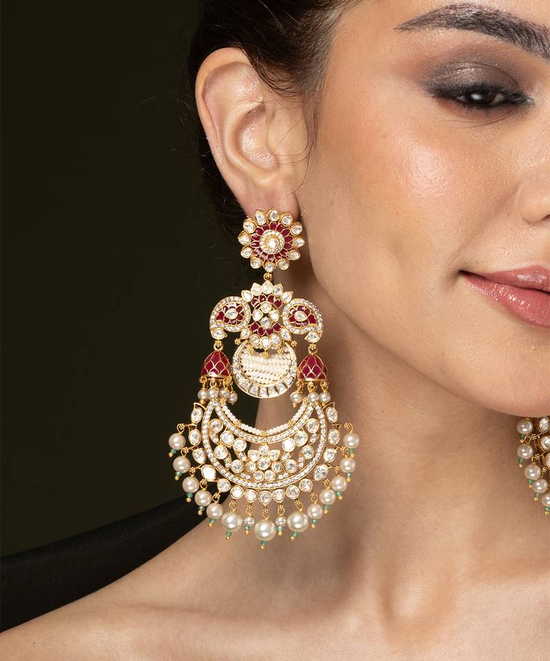 | Product Description | Stunning Oversized Chaandbaali Earrings Accented With Rich Ruby Toned Stones And Brilliant Clear Accents. The Crescent Base Is Beautifully Finished With Multiple Hanging Pearl Clusters, Perfect For A Grand Gift.