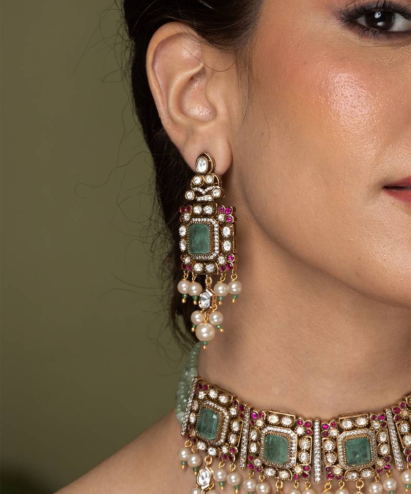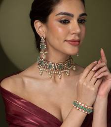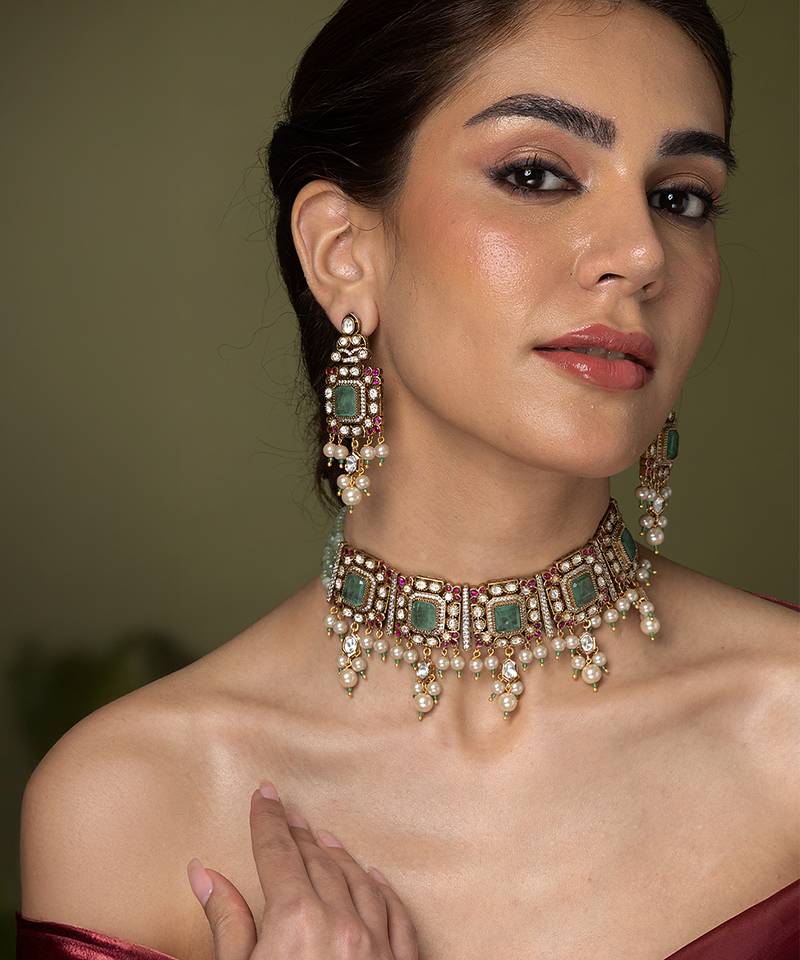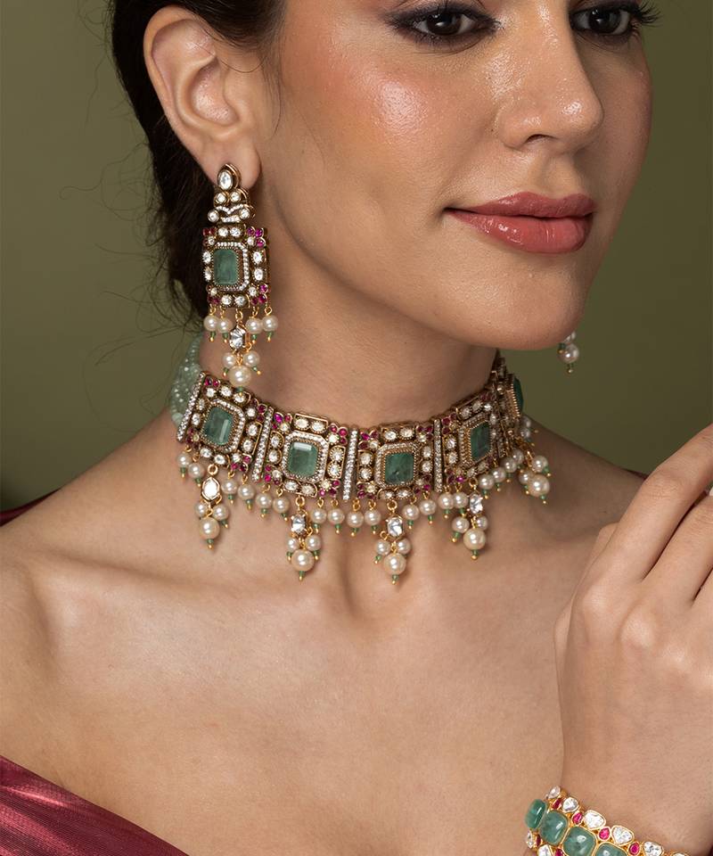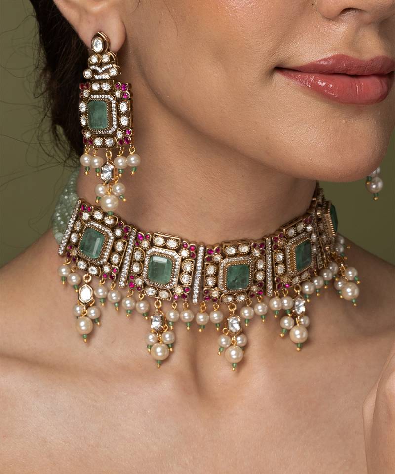 | Product Description | An Elegant Choker Set Featuring Square Green Stone Sections Separated By Accents Of Ruby Toned Stones And Hanging Small Pearls. The Matching Green Beaded Strand Makes It An Ideal And Sophisticated Gift.