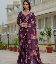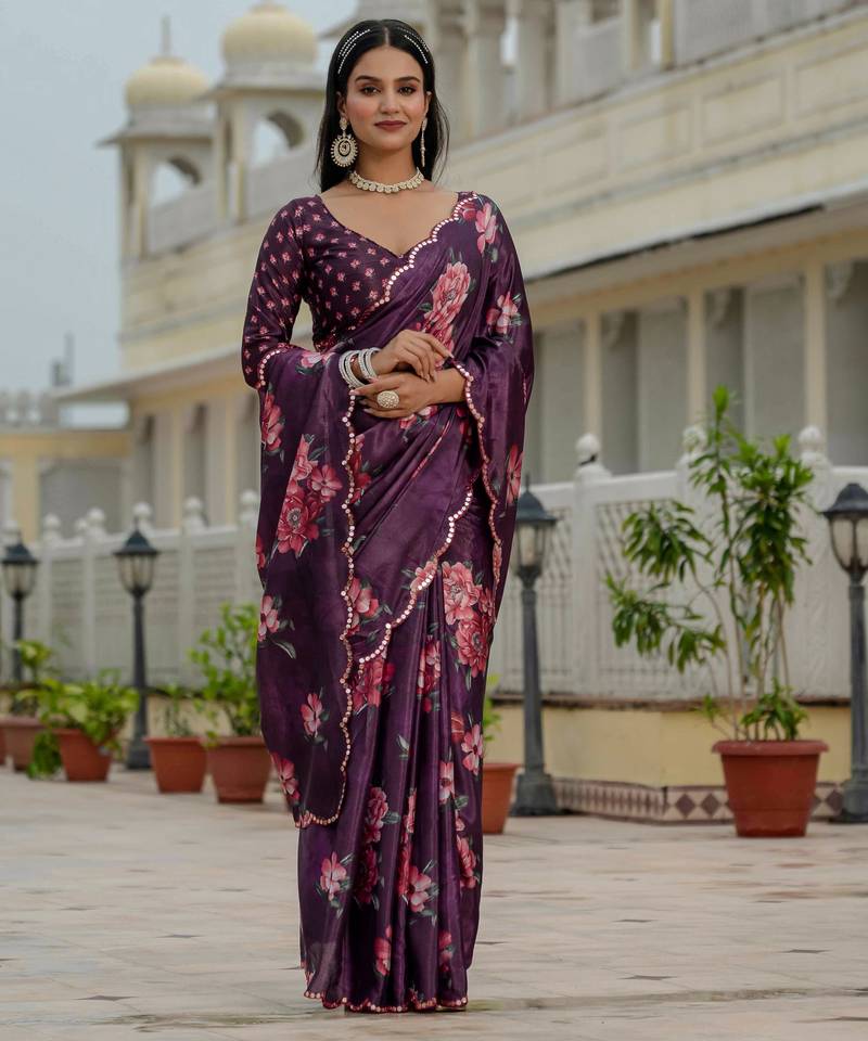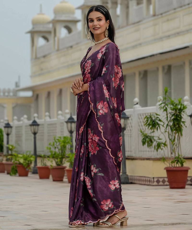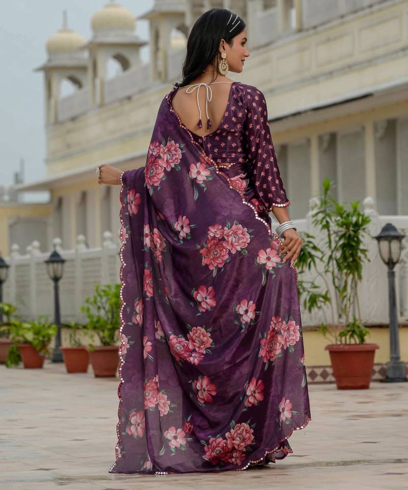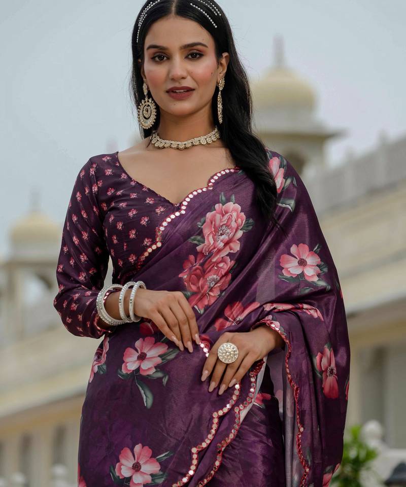 Product Name Wine Chinon Digital Print With Mirror Saree With Blouse