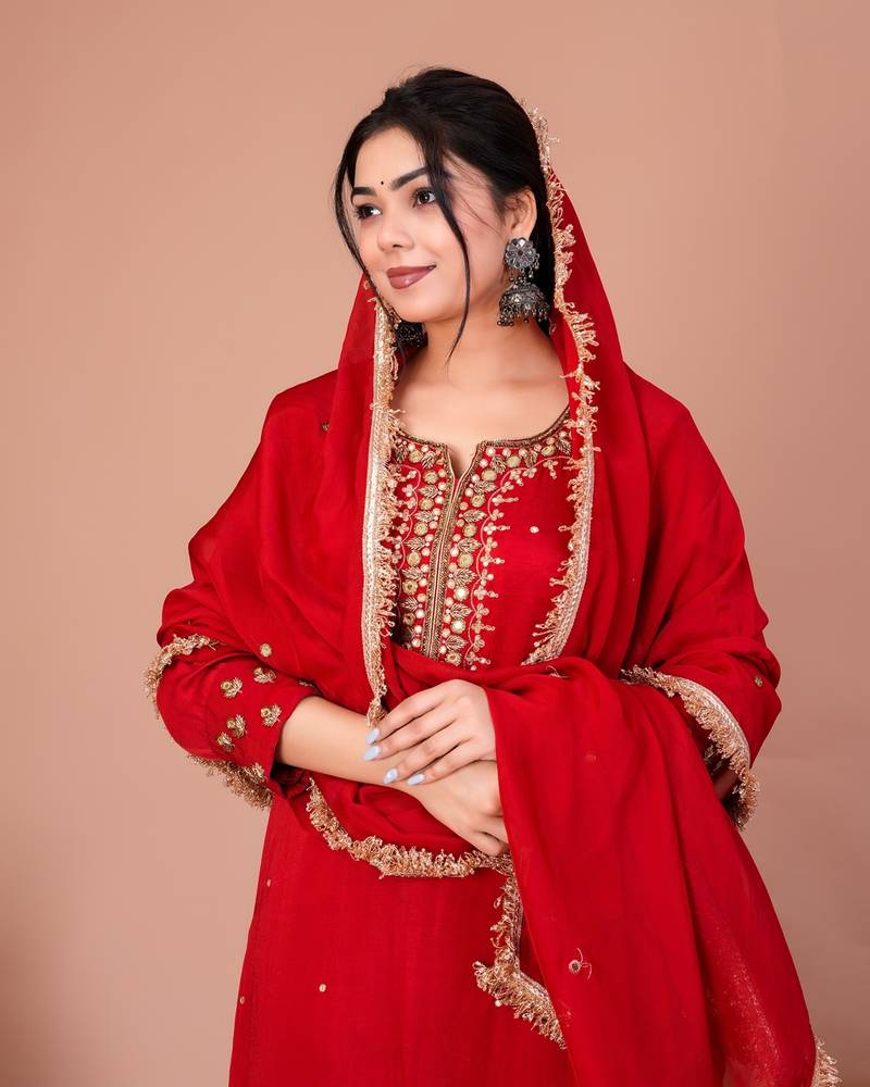 Red viscose embroidered kurta sets