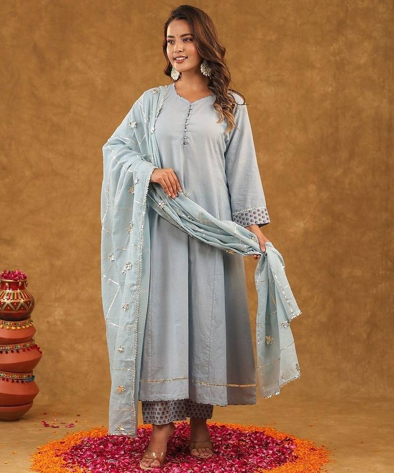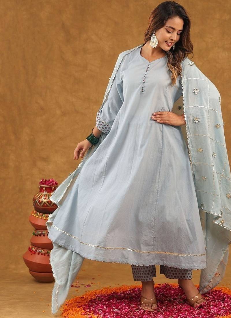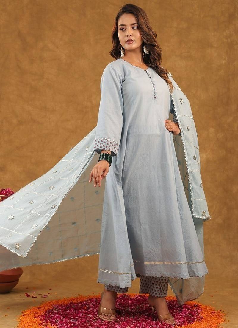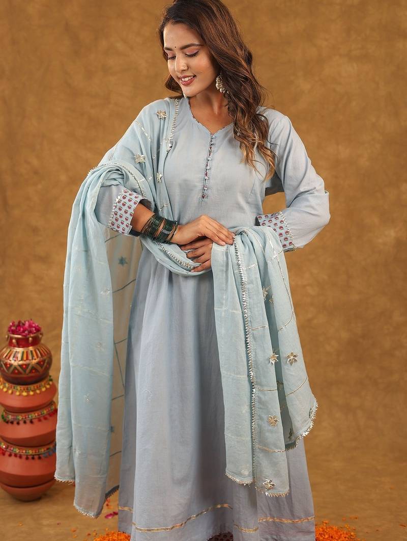 This Beautiful Ethnic Ensemble Is Blue And Multi Color Block Printed Anarkali Set With Palazzo Pants And A Heavy Dupatta. It Is A Popular Style Of Traditional Indian Wear, Often Referred To As An Anarkali Suit Set, Perfect For Various Occasions From Festive Gatherings To Casual Fastivle Wear! Design: The Set Typically Features Exquisite Block Prints In A Vibrant Floral Or Motifs Pattern, Primarily In Shades Of White With Green And Possibly Other Accent Colors.! Style: The Kurta (Tunic) Is Often An Anarkali Style, Which Has A Flared, Long Length (Calf To Ankle) And A Snugly Fitted Bodice. The Set Usually Includes Straight Fit Or Palazzo Style Pants And A Matching Or Complementary Dupatta (Scarf). Material: These Sets Are Commonly Made From Pure Doria Duptta Or A Cotton Blend Fabric, Making Them Soft, Breathable, And Comfortable For All Fastivle. The Dupatta May Be Made Of Cotton Blend! Details: The Attire Can Include Details Such As A Swetheart Neck Or Round Neckline, Three Quarter Length Sleeves, And Delicate Lace Work Or Gotta Patti Embellishments.