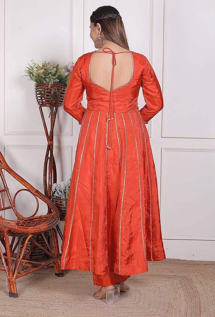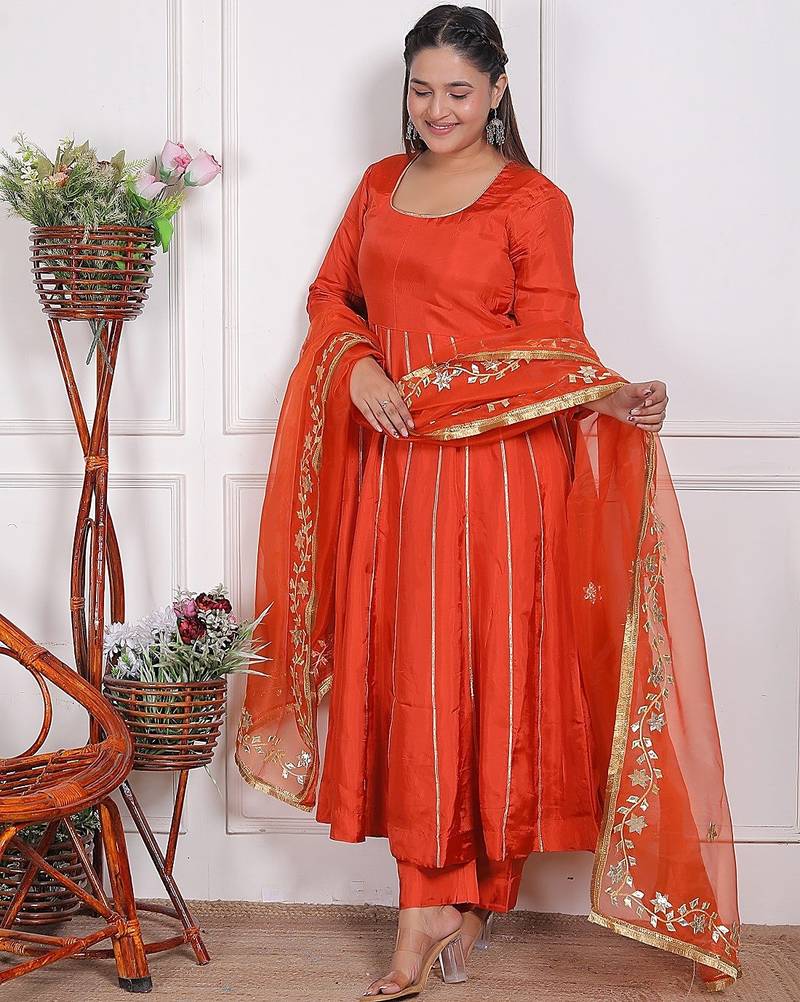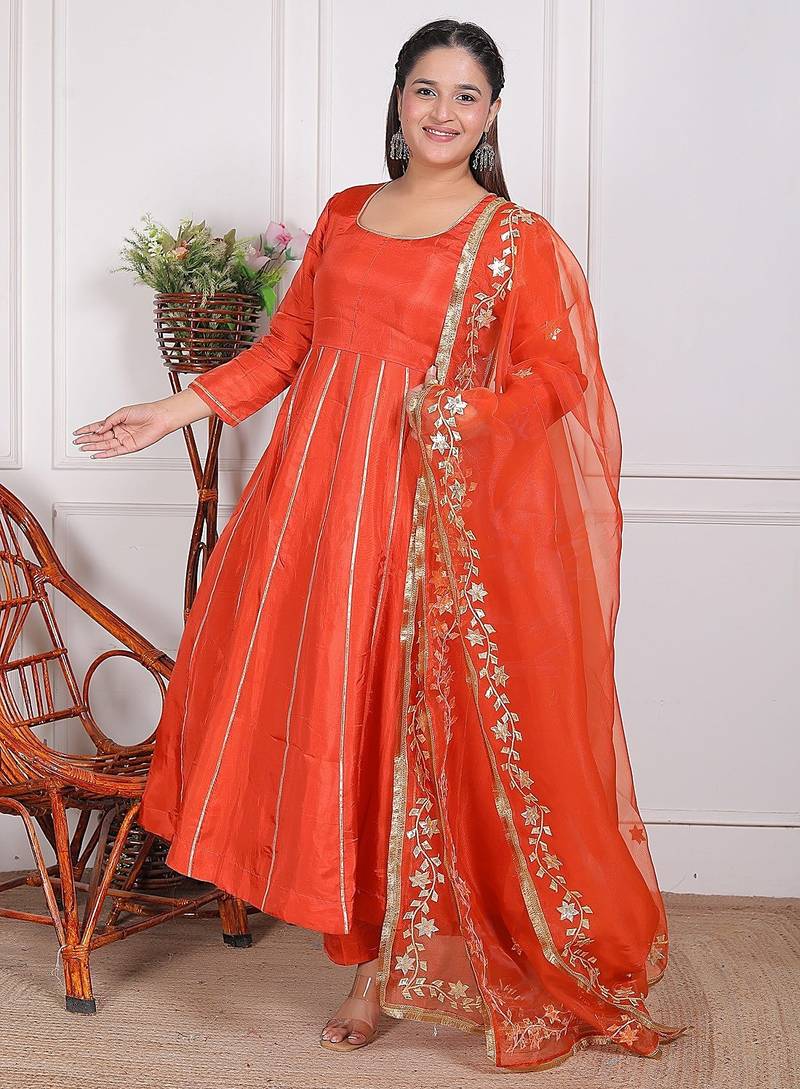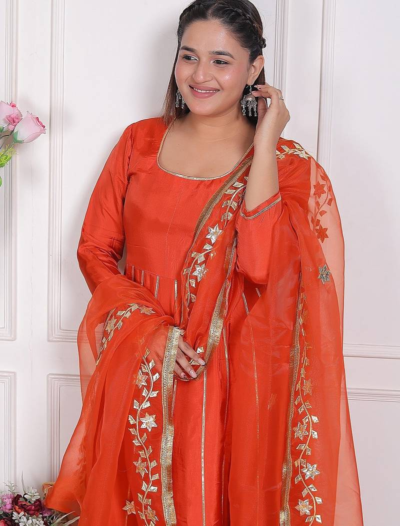 | Product Description | This Ethnic Outfit Is A Orange Embroidered Pure Crape Kurta With A Matching Oraganza Dupatta, A Popular Style Of Indian Traditional Wear. This Is A Three Piece Suit Set Featuring Anarkali Kurta (Tunic Top), Pants (Wide Legged And Flared, Often Tiered), And A Matching Dupatta (Scarf).The Set Is A Rich Shade,. The Kurta Has Intricate Embroidery And Gotta Work On The Round Neckline/Yoke And The 3/4 Of The Sleeves. The Hem Of The Kurta,The Borders Of The Dupatta Also Feature Complementary Embroidered Or Gota Patti Detailing In A Contrasting Light Color, Likely Silver Or White. .This Style Of Embroidered Suit Set Is Versatile And Often Worn For Festive Celebrations, Weddings, Parties, Or Other Special Occasions. |