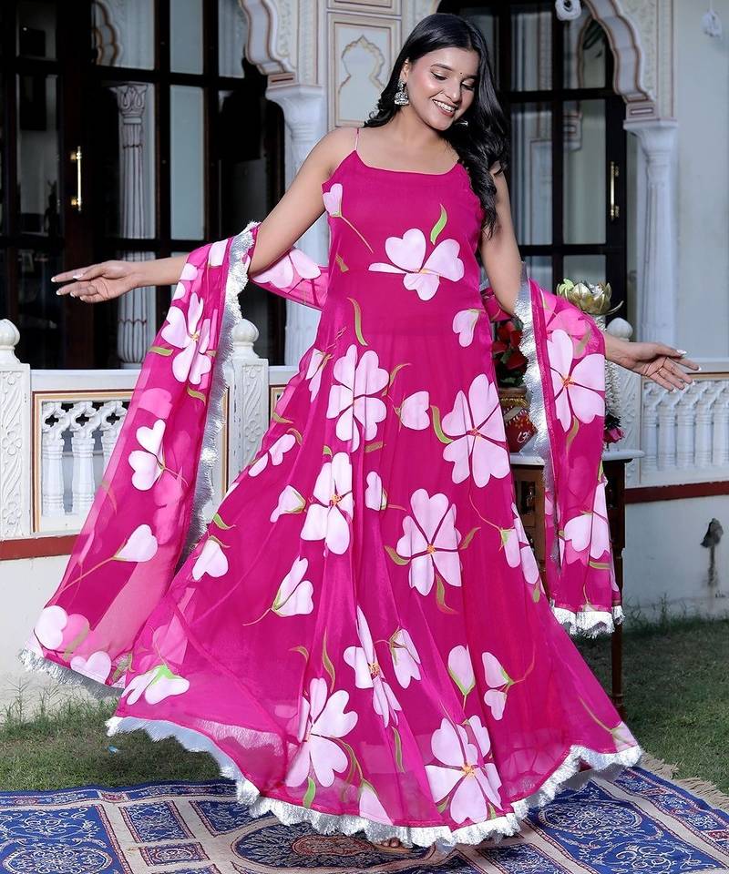 This Beautiful Ethnic Ensemble Is A Rani Big Butta Mraganka Style Set With Palazzo Pants And A Dupatta. It Is A Popular Style Of Traditional Indian Wear, Often Referred To As An Mraganka Suit Set, Perfect For Various Occasions From Festive Gatherings To Casual Fastivle Wear! Design: The Set Typically Features Exquisite Hand Prints In A Vibrant Floral Or Motifs Pattern, Primarily In Shades Of White With Rani And Possibly Other Accent Colors.! Style: The Kurta (Tunic) Is Often An Mraganka Style, Which Has A Flared, Long Length (Calf To Ankle) And A Snugly Fitted Bodice. The Set Usually Includes Straight Fit Or Palazzo Style Pants And A Matching Or Complementary Dupatta (Scarf). Material: These Sets Are Commonly Made From Pure Organza Or A Cotton Blend Fabric, Making Them Soft, Breathable, And Comfortable For All Fastivle. The Dupatta May Be Made Of Georget ! Details: The Attire Can Include Details Such As A Swetheart Neck Or Round Neckline,And Slavelase And Delicate Lace Work Or Details Embellishments.