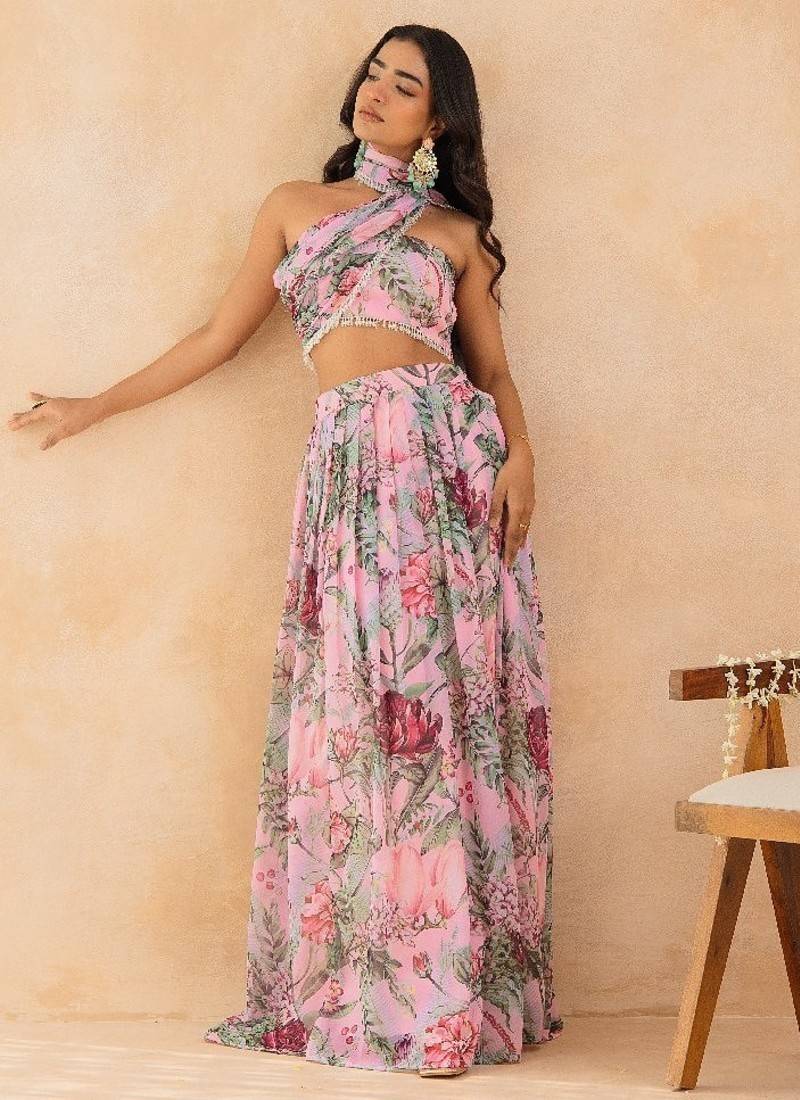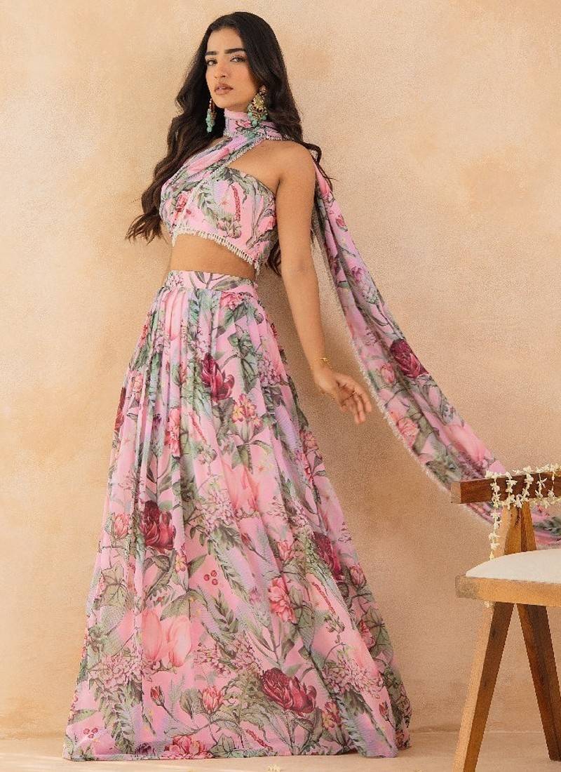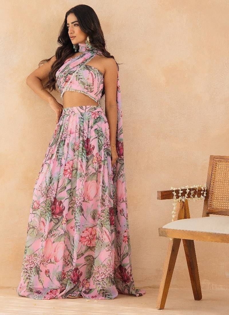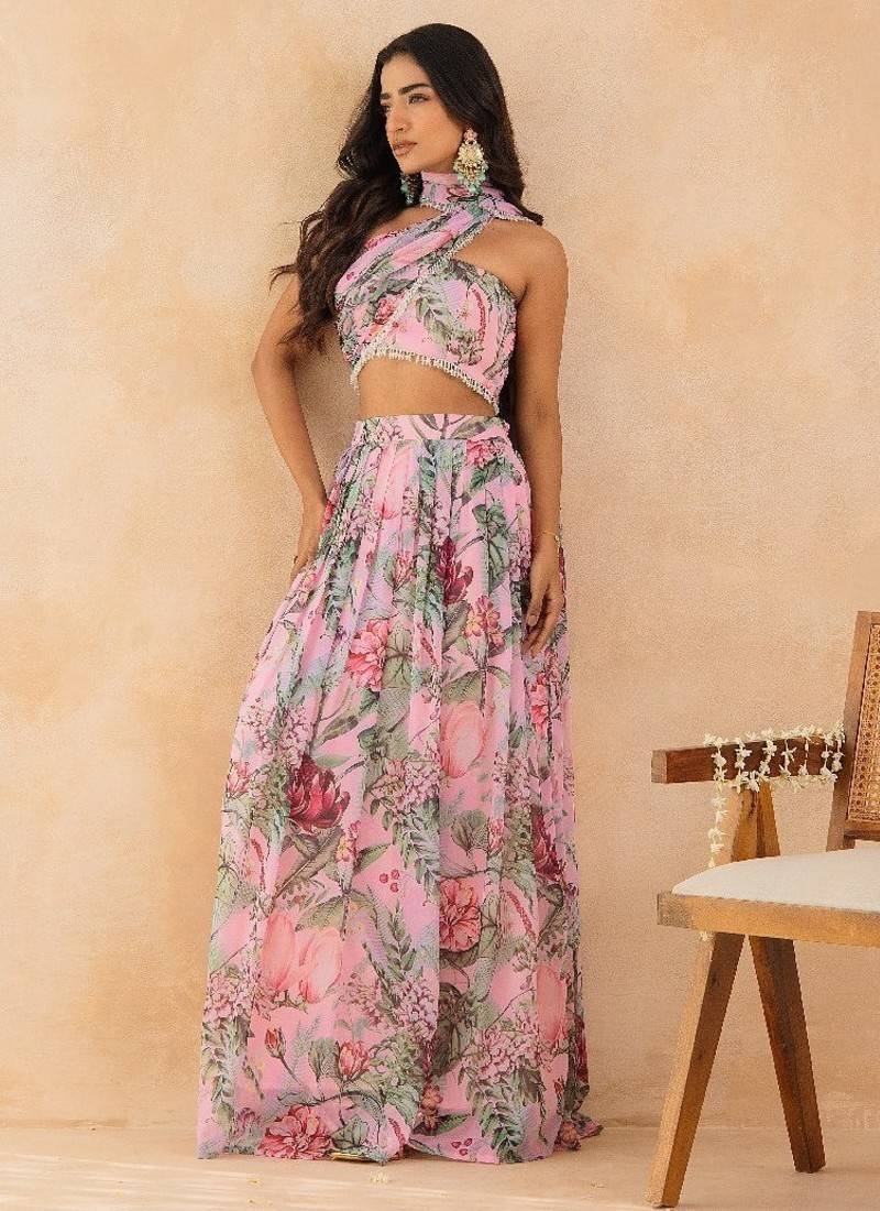 Product Name | Baby Pink Floral Skirt Set With Crystal Embellished Tube Blouse & Attached Dupatta | |