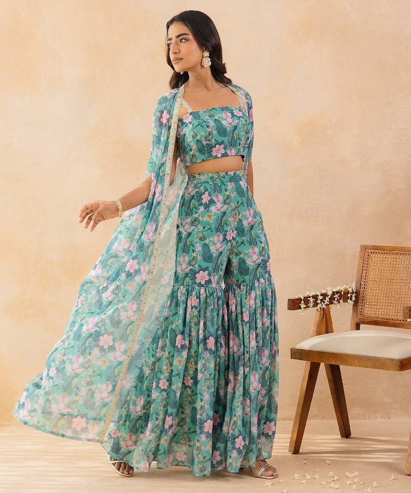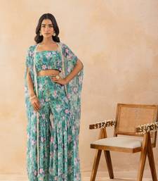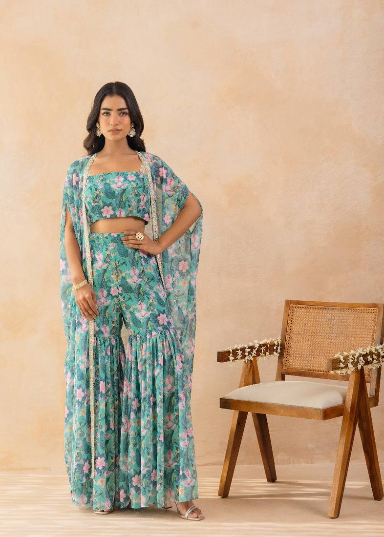 Product Description | Bring Effortless Elegance To Your Festive Wardrobe With This 3 Piece Indo Western Set In A Refreshing Floral Aqua Green Hue. The Look Features A Padded Embellished Strap Blouse, A Flowy Printed Cape, And A Flared Sharara, Blending Traditional Charm With A Modern Twist. Crafted With Lining In Both Blouse And Bottom For Comfort, And A Side Zip Closure For Ease Of Wear, This Ensemble Is Perfect For Festive Gatherings, Cocktails, And Mehendi Celebrations. Product Measurements: Cape Length: 54" Blouse Length: 14.5" Sharara Length: 40" |
