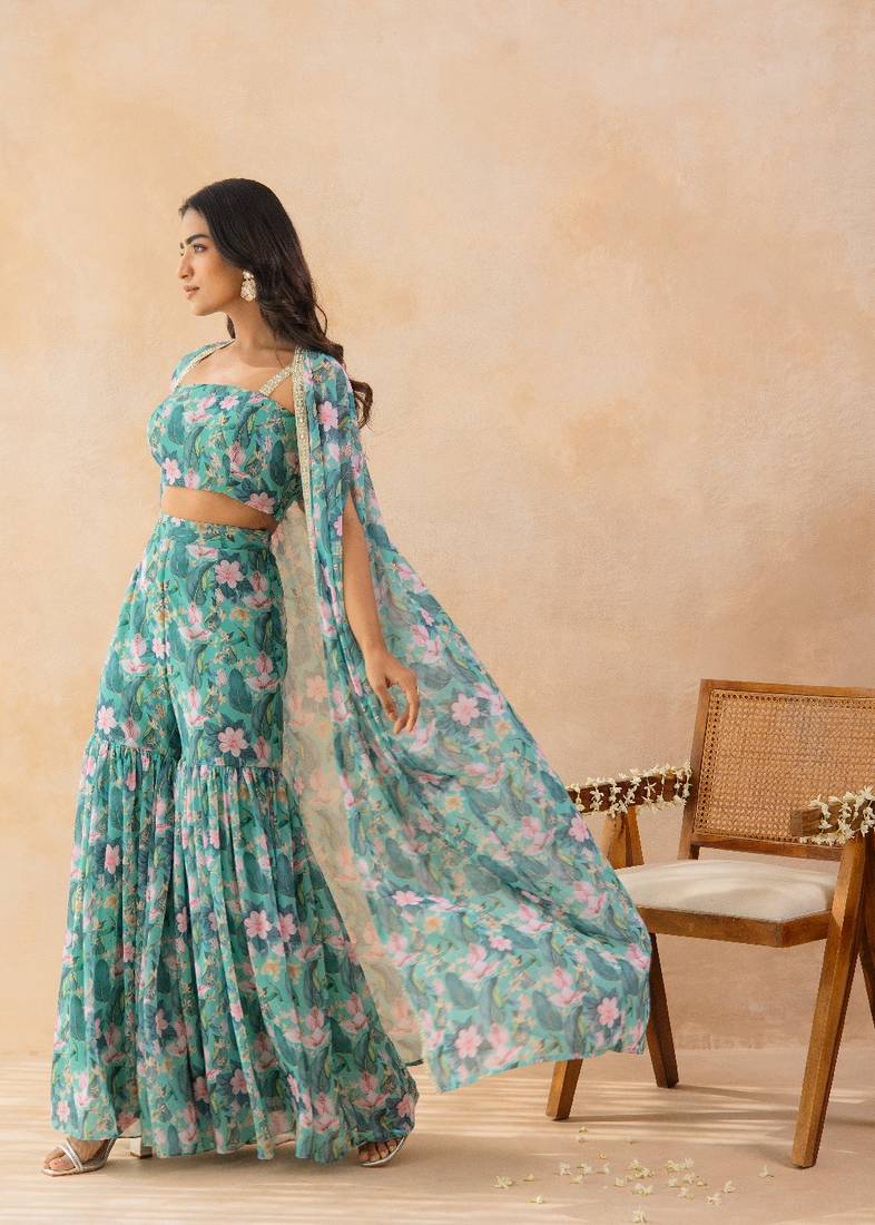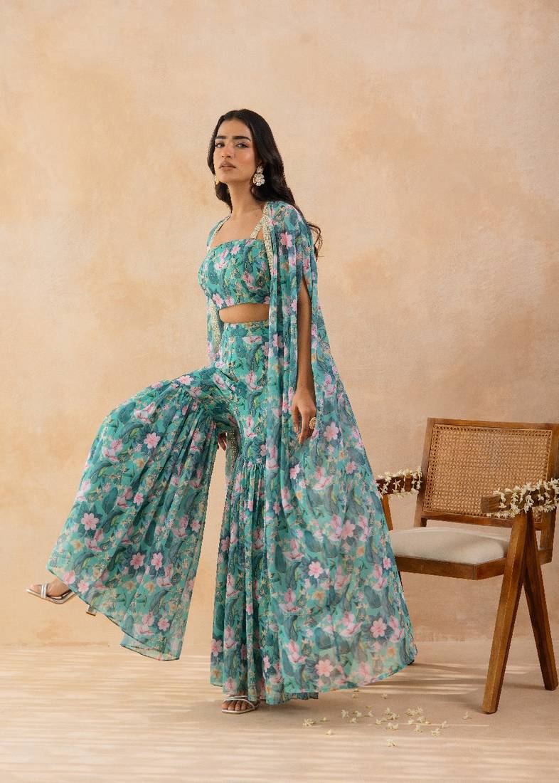 Product Name | Floral Aqua Green Embellished Cape Sharara Set | |