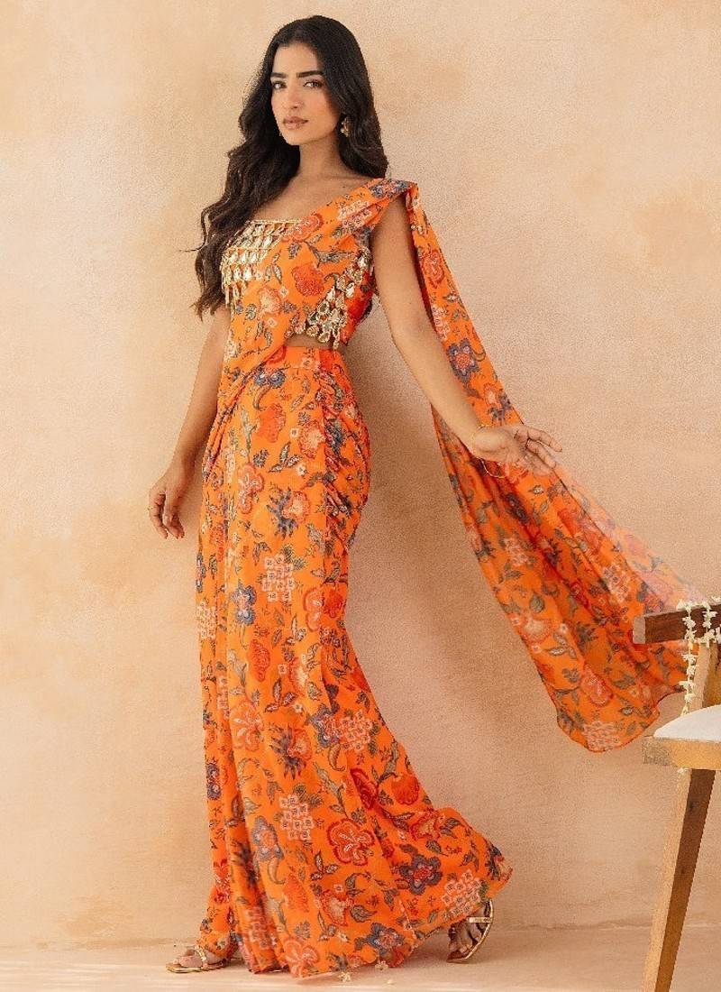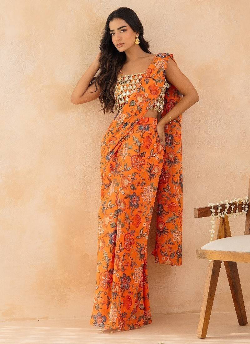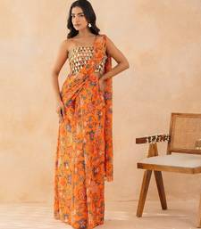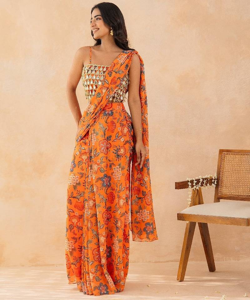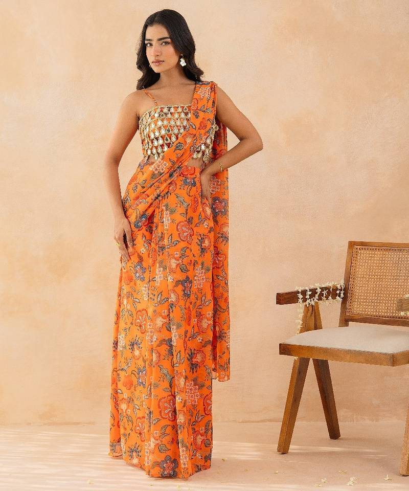 Marigold floral printed pre draped saree with mirror embellished blouse