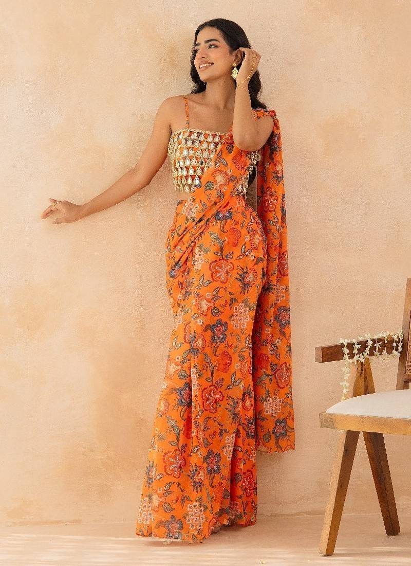 Product Name | Marigold Floral Printed Pre Draped Saree With Mirror Embellished Blouse | |