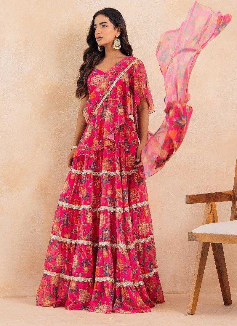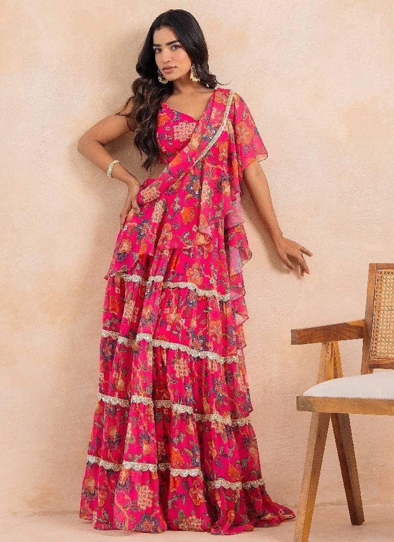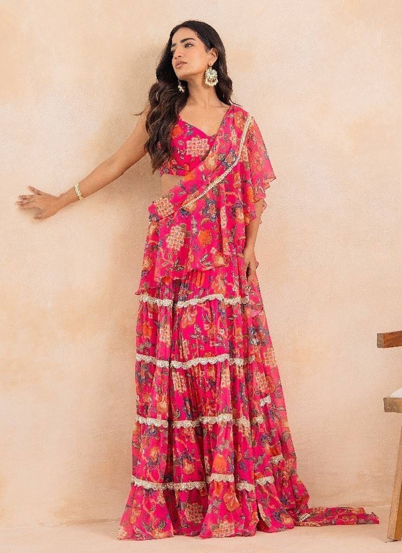 Product Name | Pink Floral Flared Pre Draped Saree | |