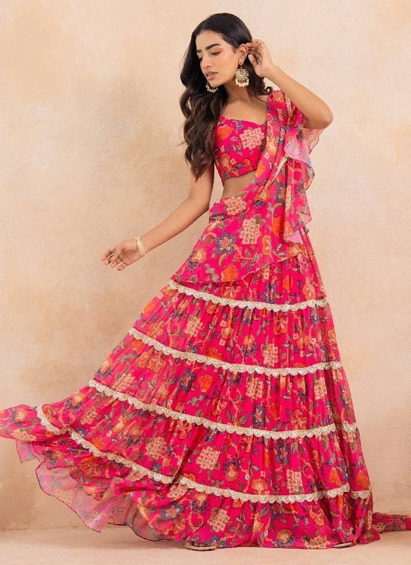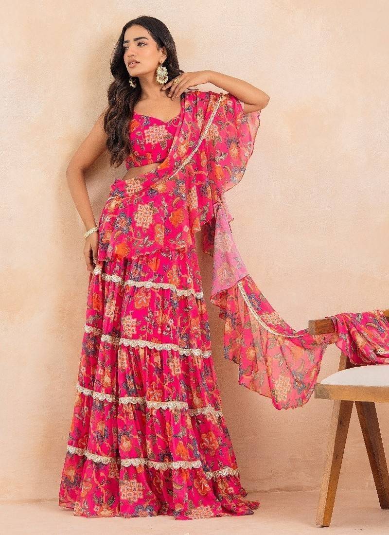 Product Description | Radiate Charm In Aabha, A Dreamy Pink Floral Pre Draped Saree Set Designed For The Modern Muse Who Loves Effortless Elegance. Crafted In Soft Georgette, This Ensemble Features A Flared Drape Saree With A Ruffled Palla, Paired With A Padded And Lined Blouse Intricately Embellished With Lace Detailing For A Delicate Festive Shimmer. Thoughtfully Designed With Lining Throughout For Comfort And Movement, This Set Blends Contemporary Styling With Floral Femininity. Perfect For Daytime Weddings, Festive Luncheons, And Mehendi Celebrations, It’s Your Go To Look For Timeless Grace With A Modern Twist. Product Measurements: Blouse Length: 14.5" Saree Length: 44" Fabric: Georgette (Fully Lined; Padded Blouse) |