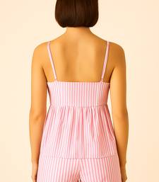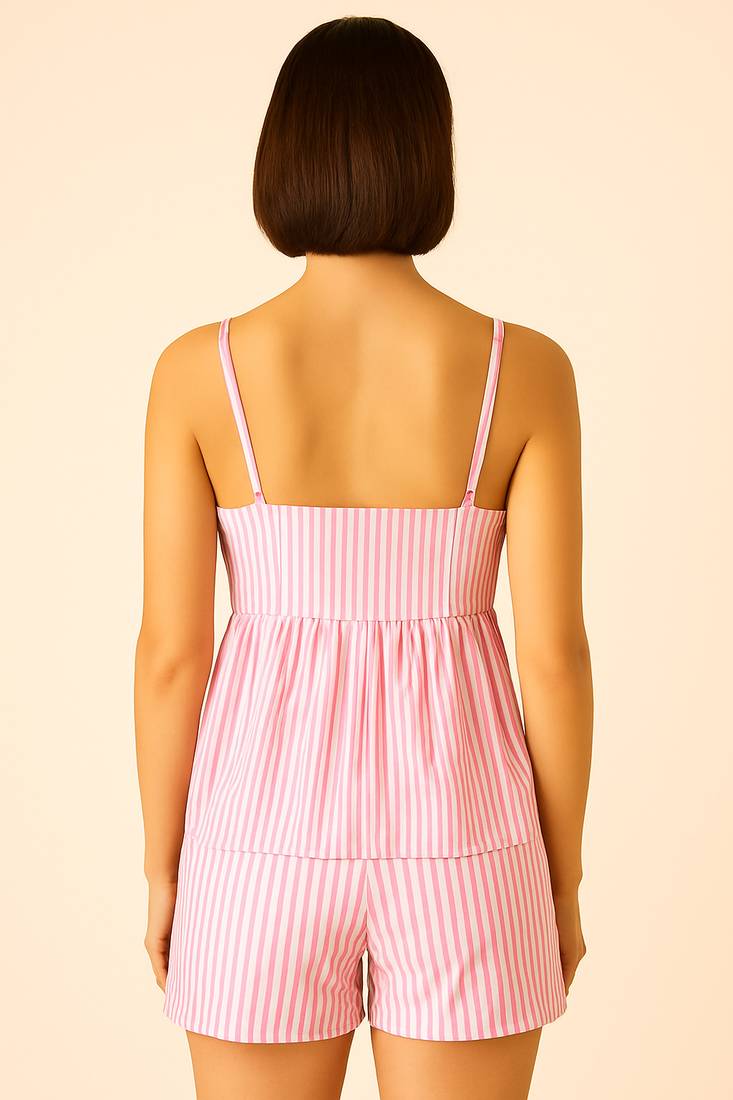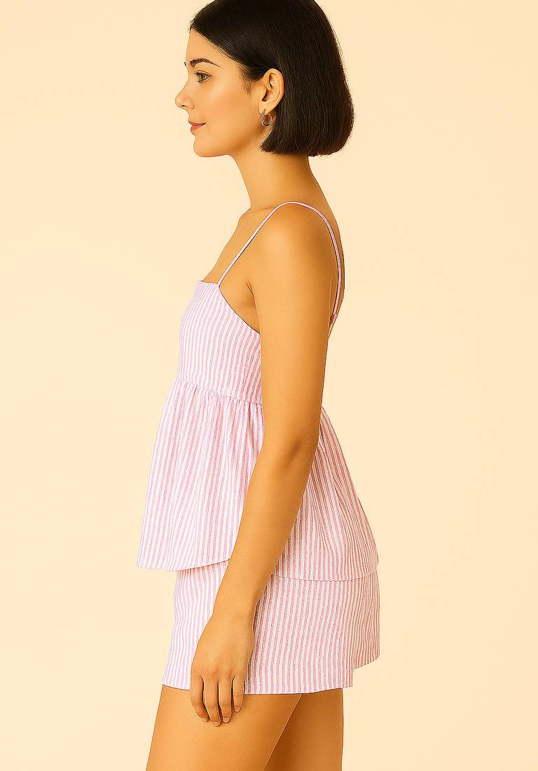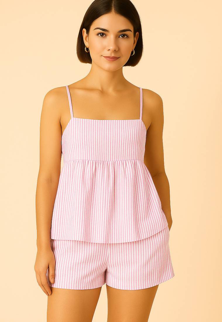 Product Name | Women Baby Pink Stripes Printed Cotton Linen Peplum Strap Top With Elastic Waist Shorts Co Ord Set | |