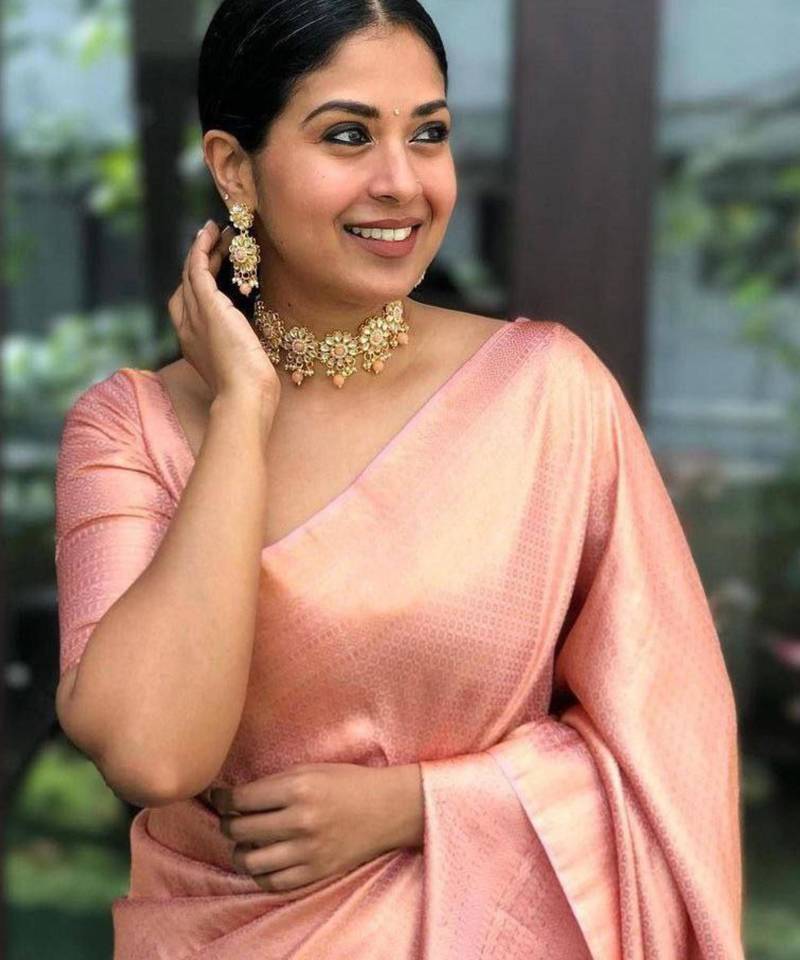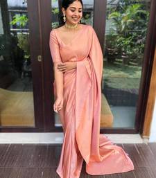 Celebrity type peach self design south silk fancy saree with unstitched blouse