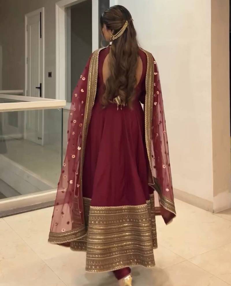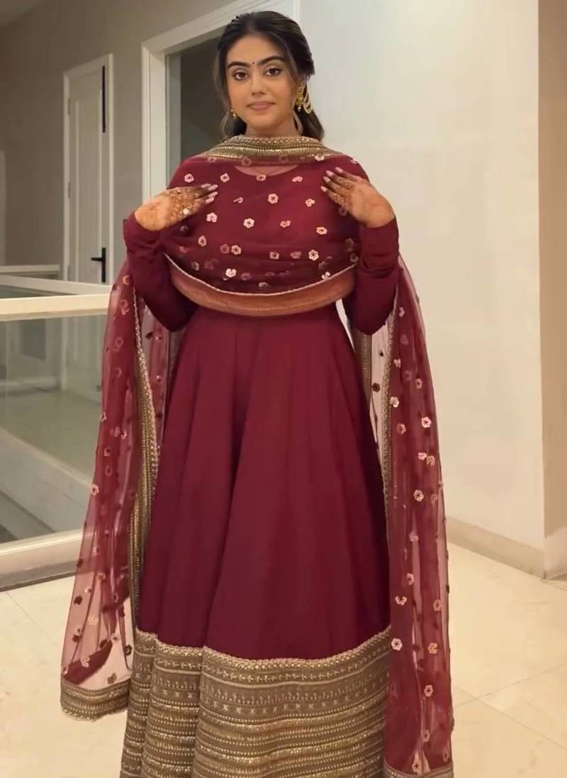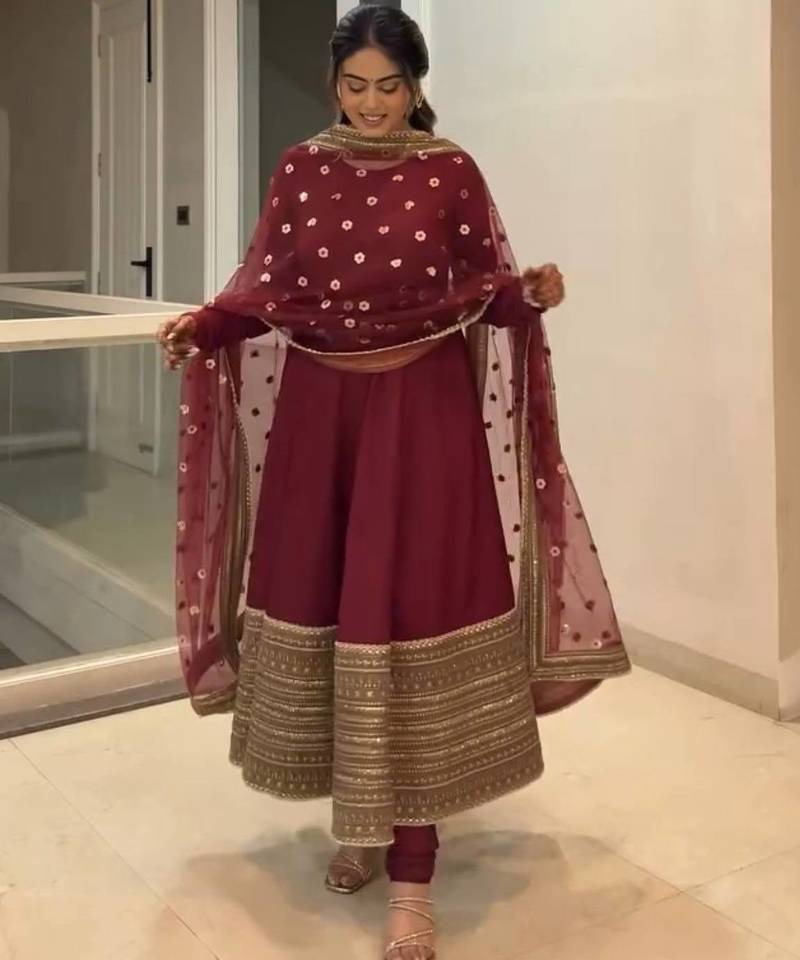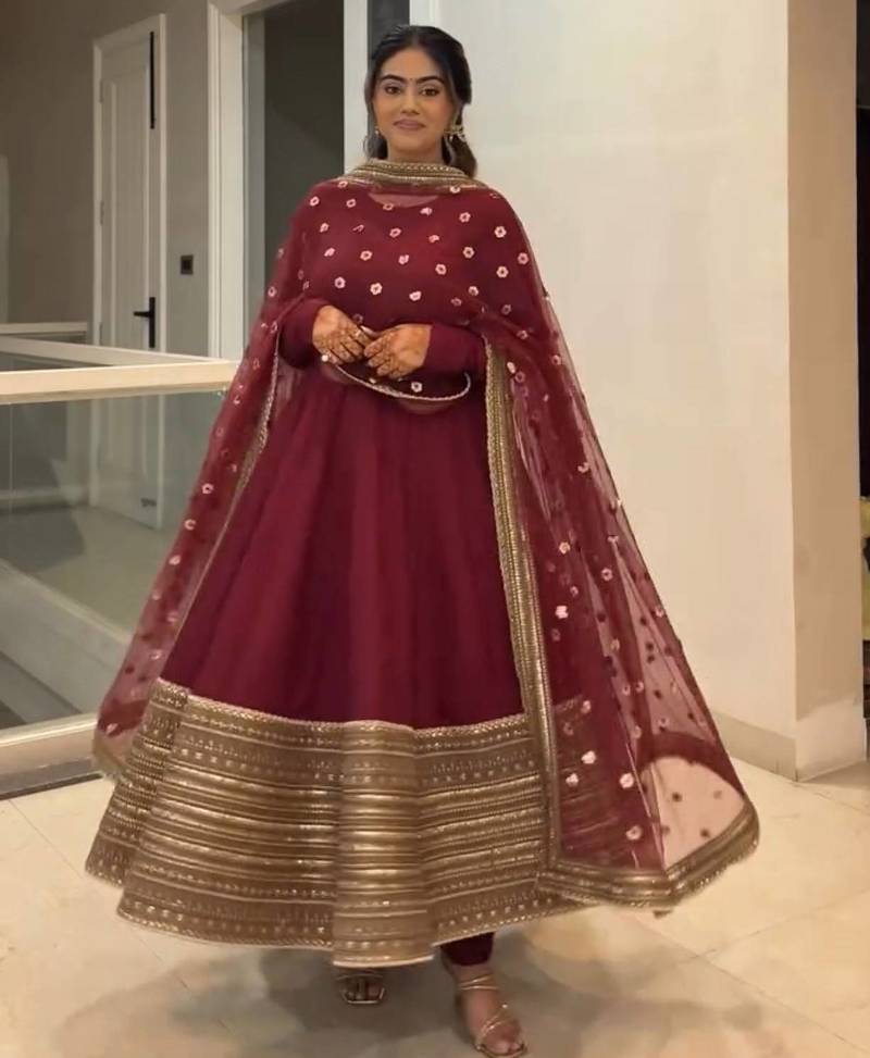 Maroon roman silk anarkali with codding sequence embroidery work,fully stitched gown style with bottom and dupatta