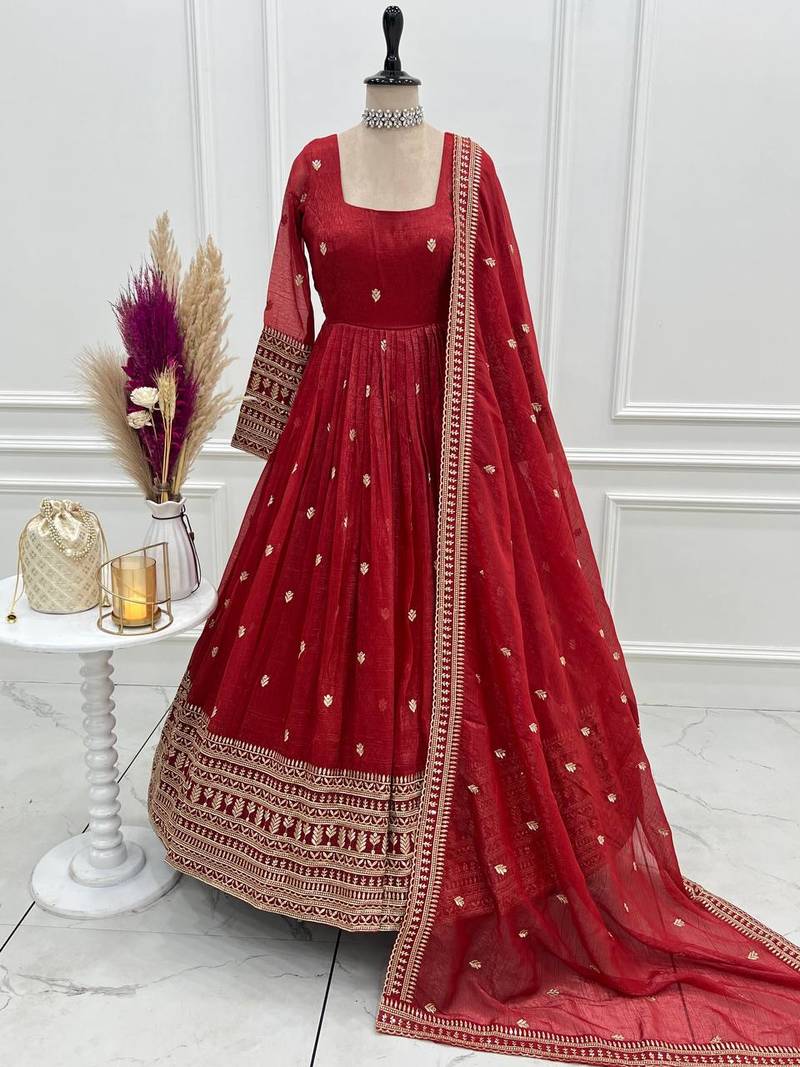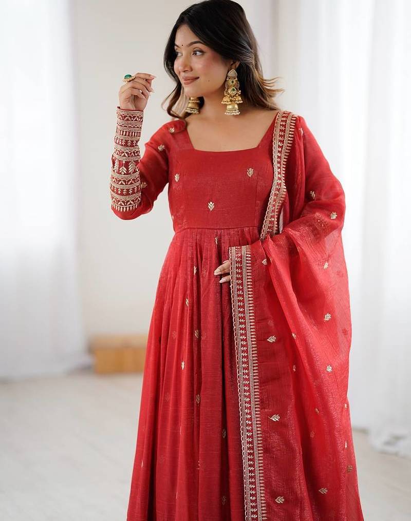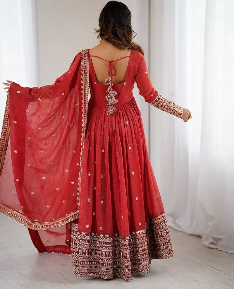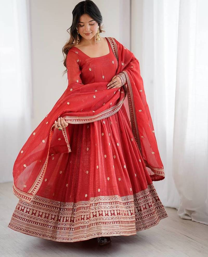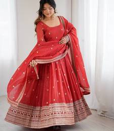 Rust crunchy silk anarkali with embroidery jari sequins work,churidar sleeve style, 3 mtr flair gown set category stitched