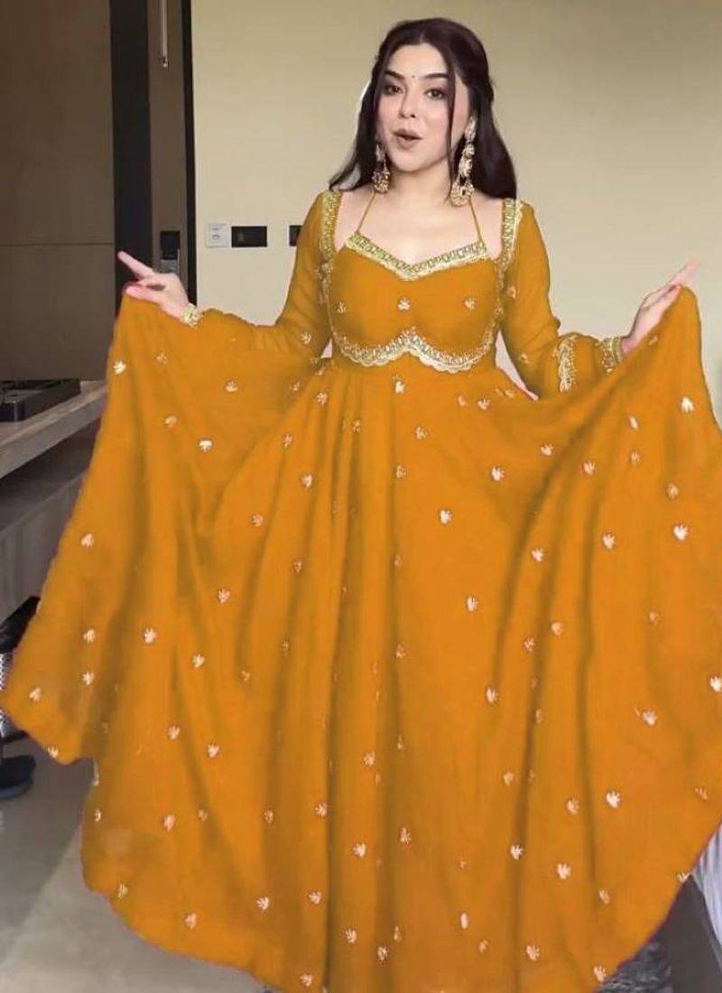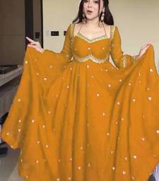 Yellow fox georgette anarkali with rembo sequence embroidery work, fully stitched gown style with bottom and dupatta