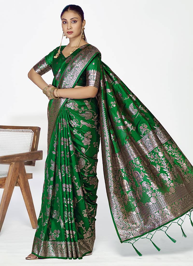 | Product Description | Make A Royal Statement With This Emerald Green Banarasi Silk Saree, Crafted With Intricate Golden Zari Motifs Throughout. The Sheen Of The Silk And The Richness Of The Weaving Make It Suitable For Any Grand Occasion.