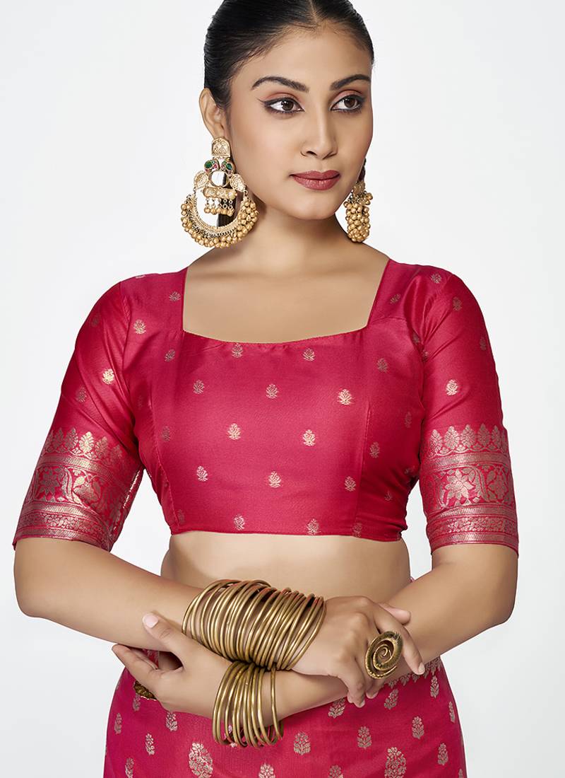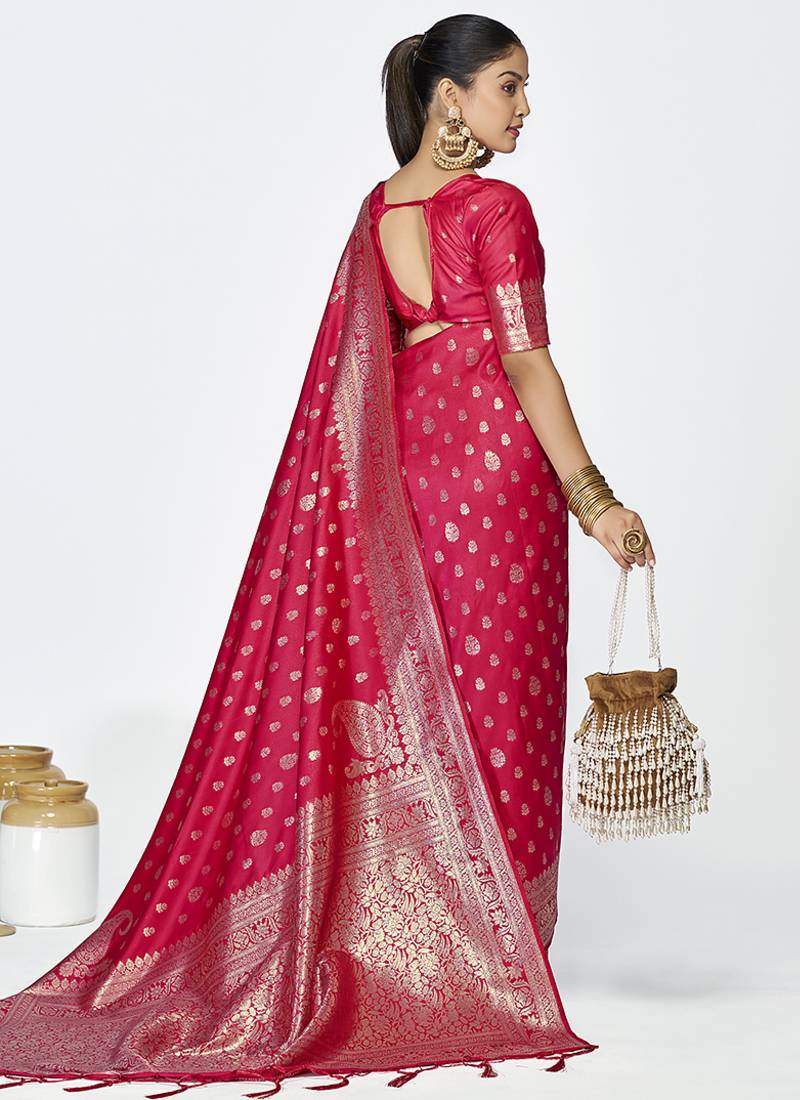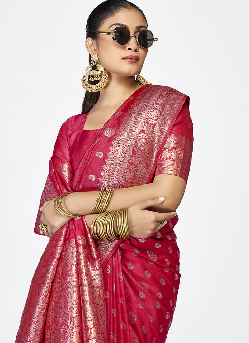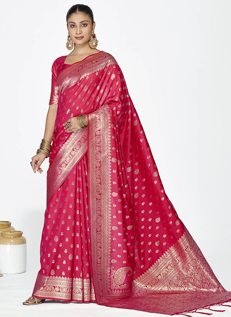 | Product Description | This Stunning Rani Pink Saree Is Crafted In Luxurious Banarasi Silk And Adorned With Intricate Golden Zari Motifs. The Elegant Border And Pallu Enhance Its Royal Charm, Making It Perfect For Weddings, Festive Occasions, And Special Celebrations. Pair It With Traditional Jewelry For A Complete Ethnic Look. |