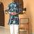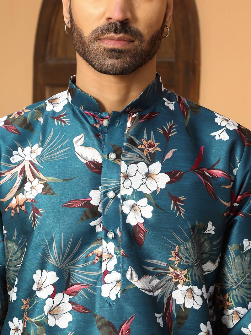 Floral printed blue mandarin collor silk blend kurta with pyjama