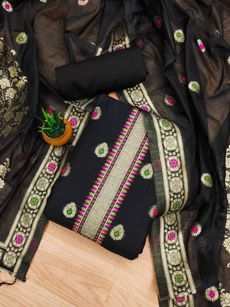 Black zari woven chanderi silk dress materials unstitched
