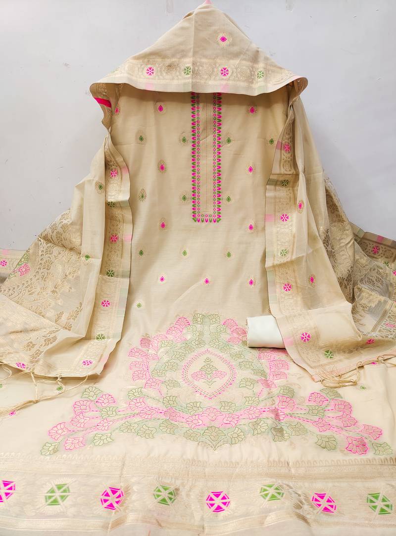 | Product Description | Catlogue Name: Chanderi Suit Vol 6 Top *Pure Chanderi Banarasi Silk 3 Mtr Cut (Including 0.40 Mtr Sleeves)* Bottom *Soft Cotton 2.50 Mtr Cut* Dupatta *Woven Chanderi Banarasi Silk 2.30 Mtr Cut With Tussels Both End* Type *Material*
