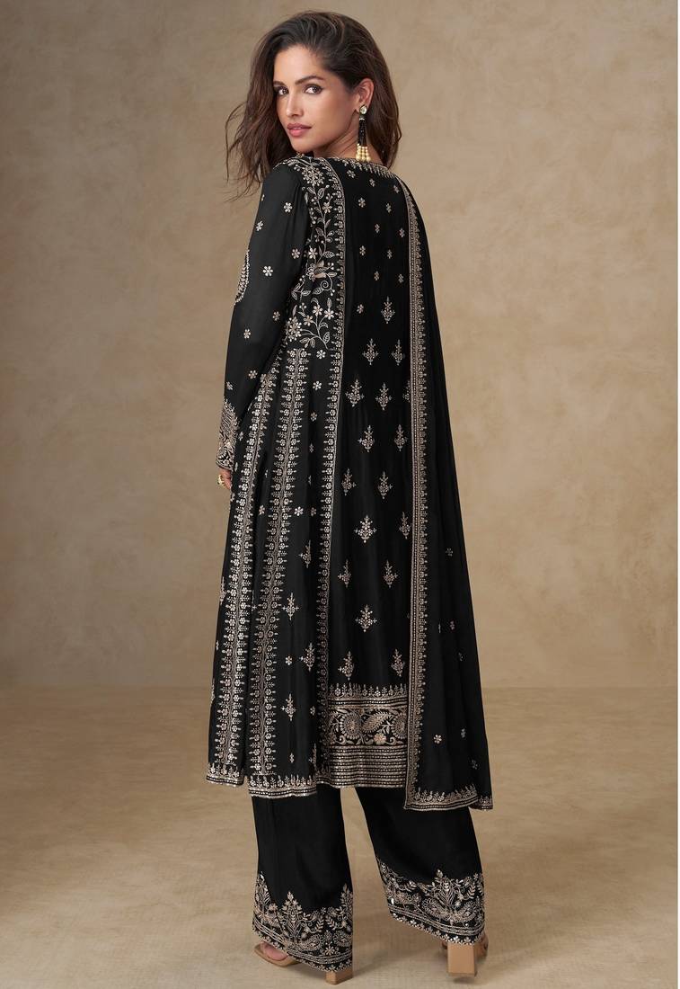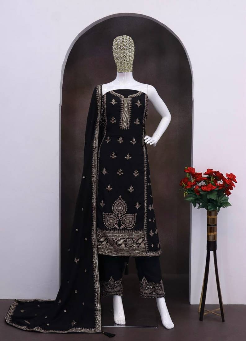 Women black embriodery sequence work chinion silk semi-stitched salwar suit semi stitched