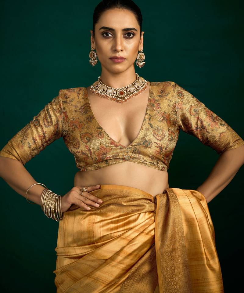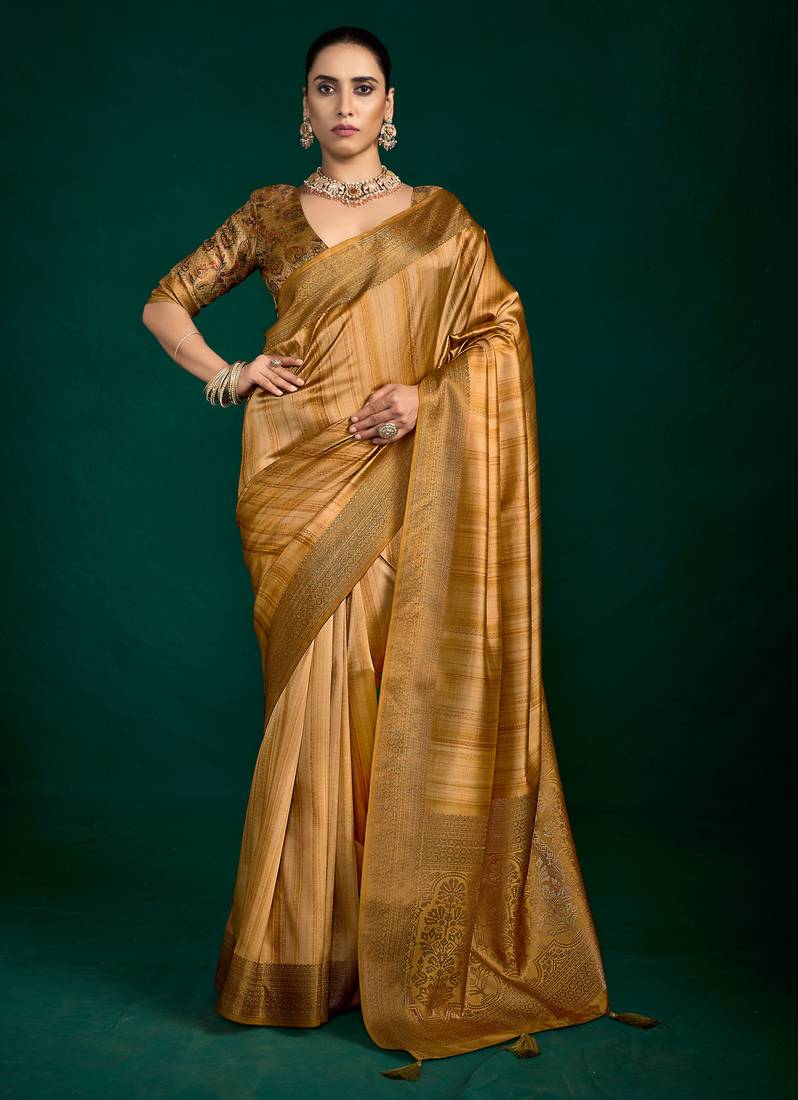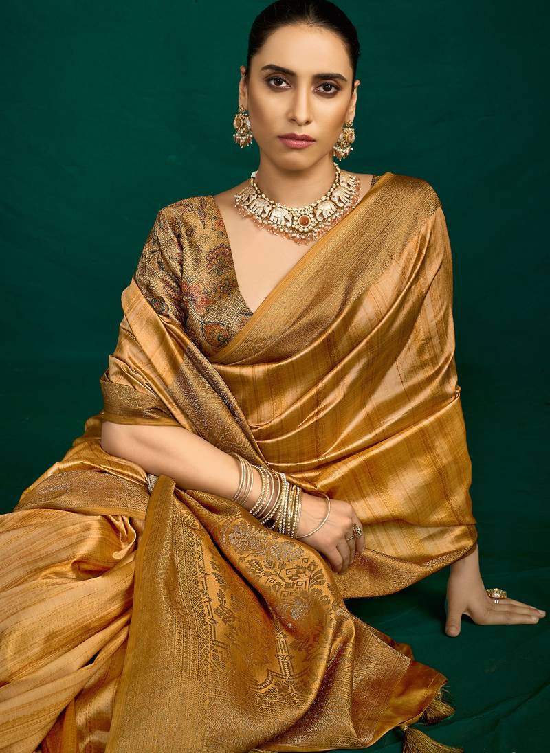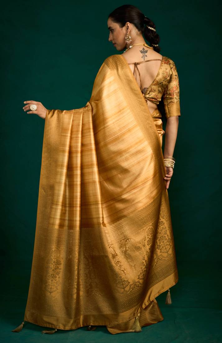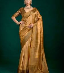 Bronze gold color beautiful tussar silk blend fabric sophisticated woven designer saree
