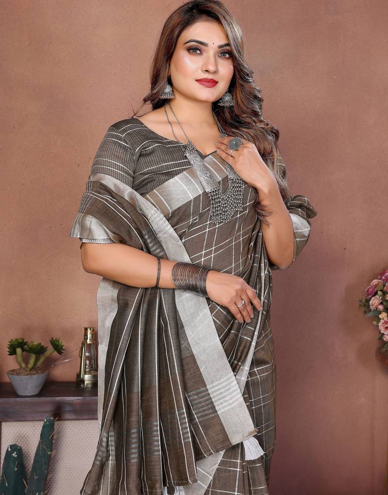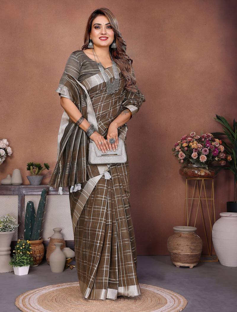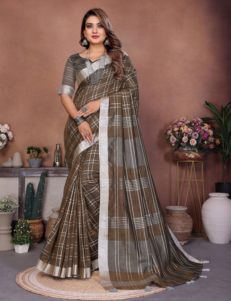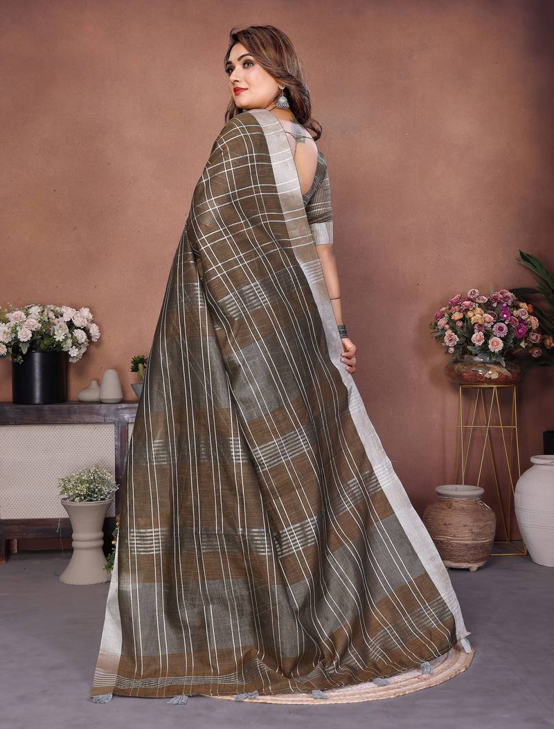 | Product Name | Brown Color Linen Cotton Fabric Woven Checks Designer Trendy Ethnic Saree | |