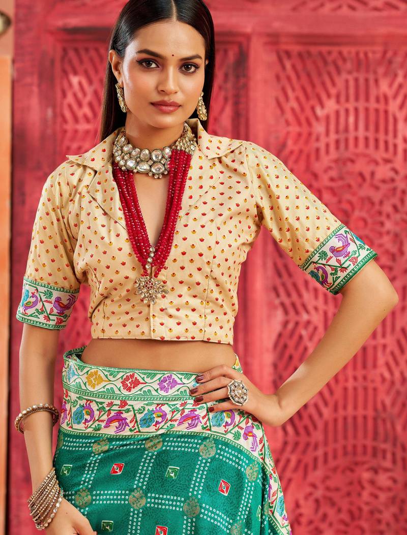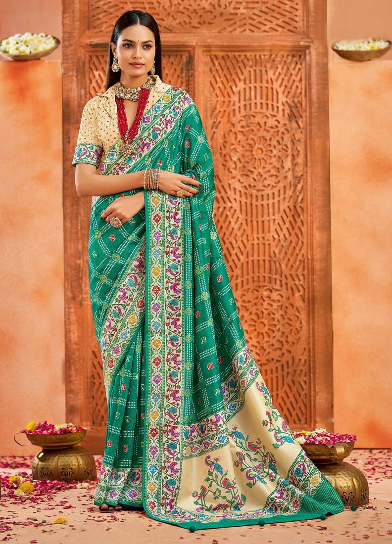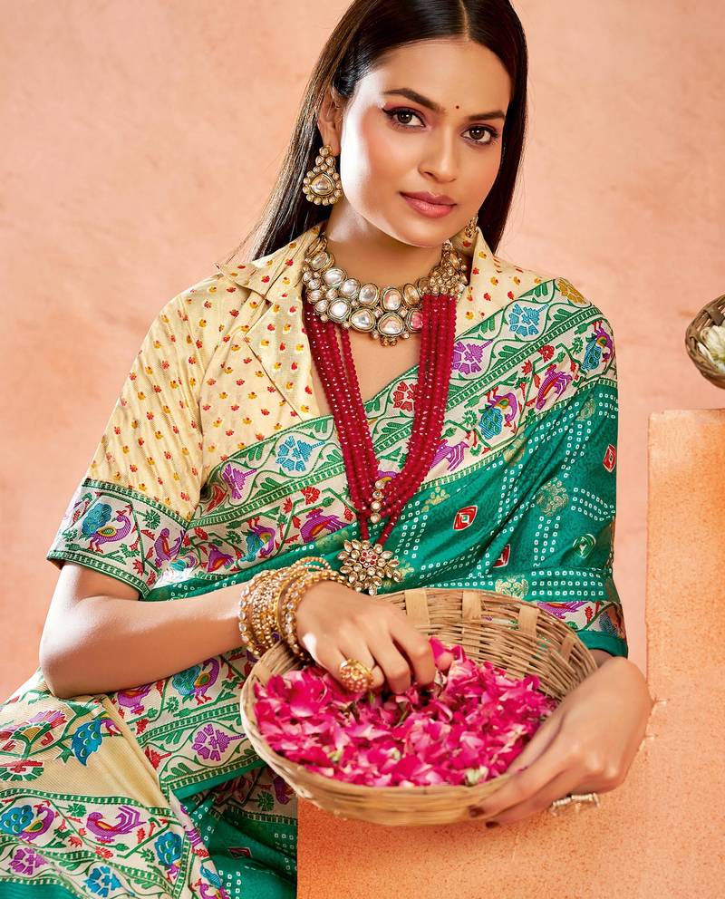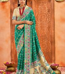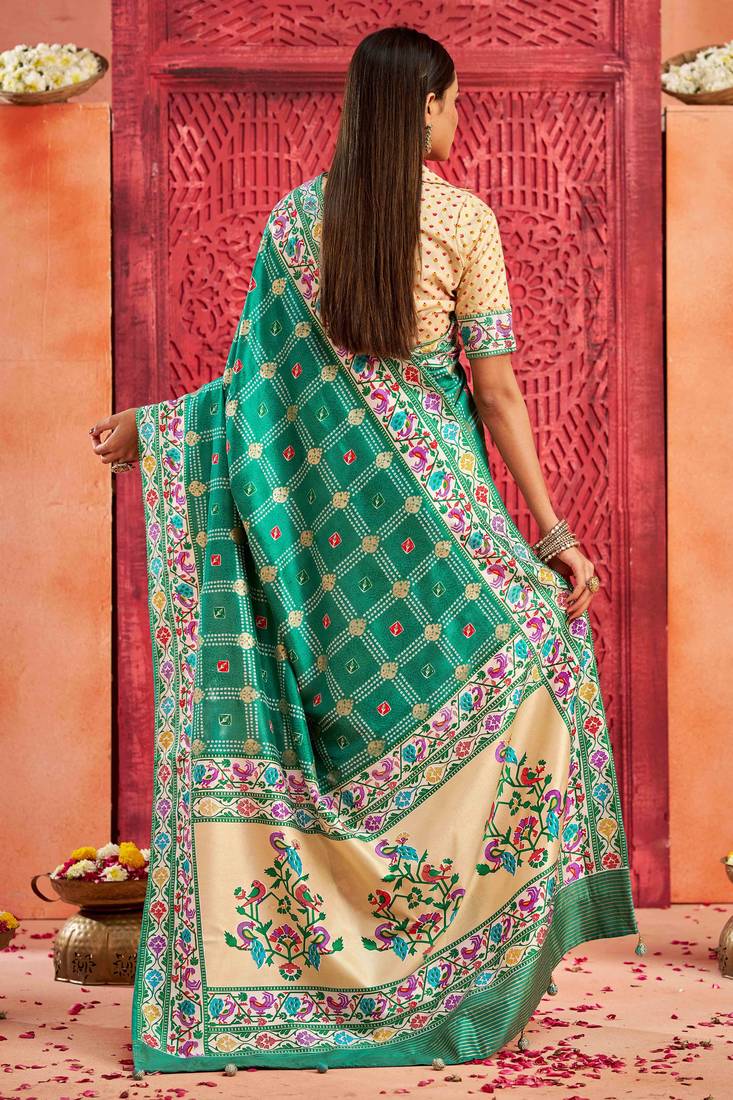 Firozi color velvet tussar silk blend fabric partywear saree with paithani pallu and traditional ghatchola print