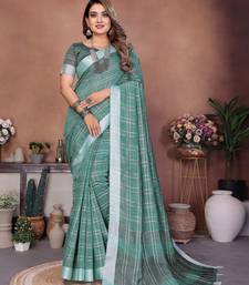 Green color linen cotton fabric woven checks designer trendy ethnic saree