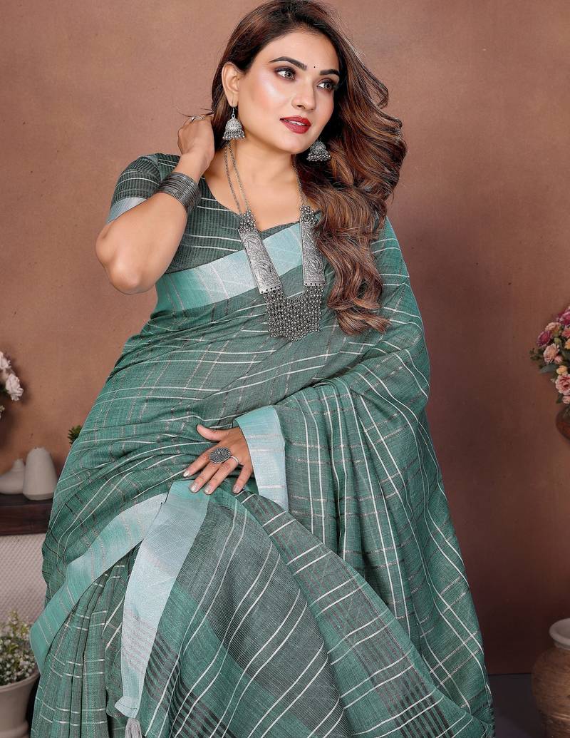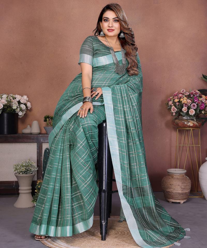 | Product Name | Green Color Linen Cotton Fabric Woven Checks Designer Trendy Ethnic Saree | |