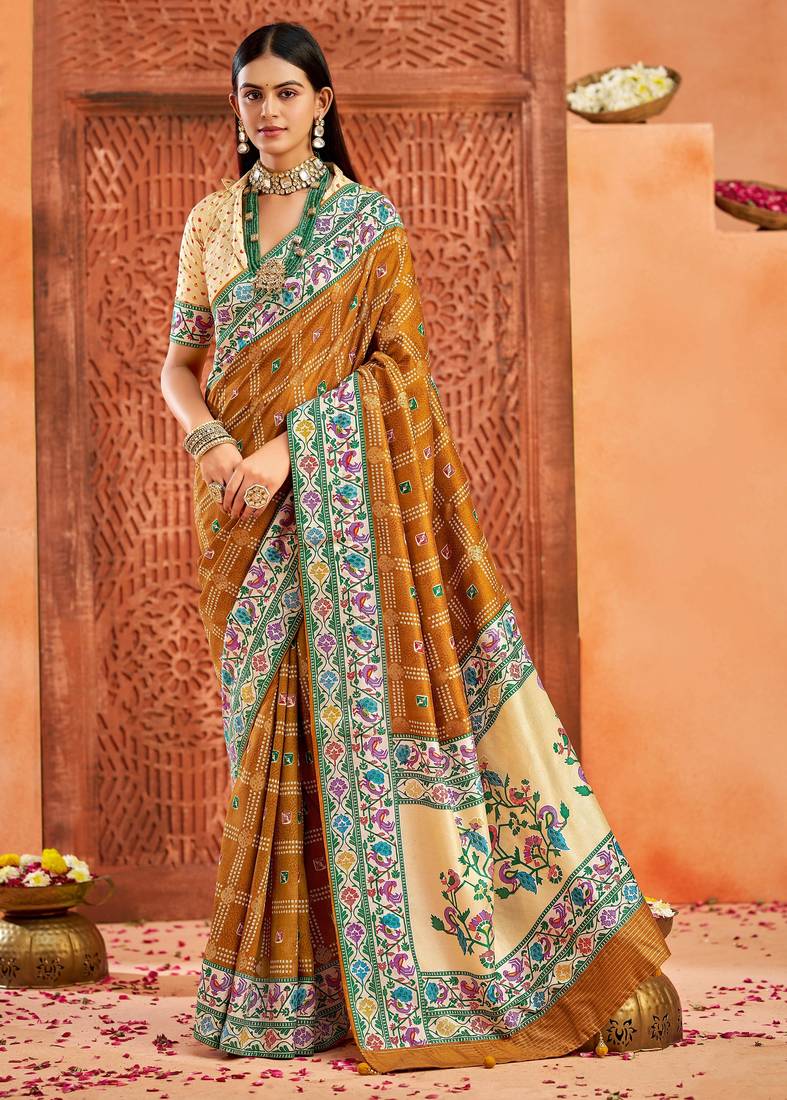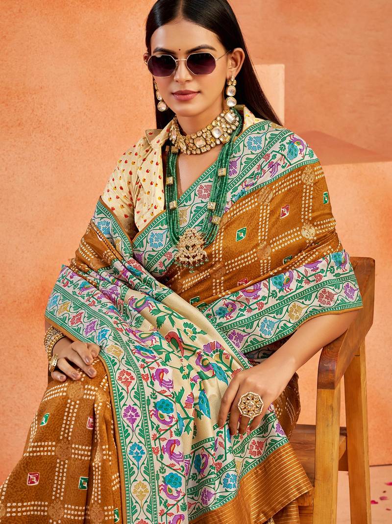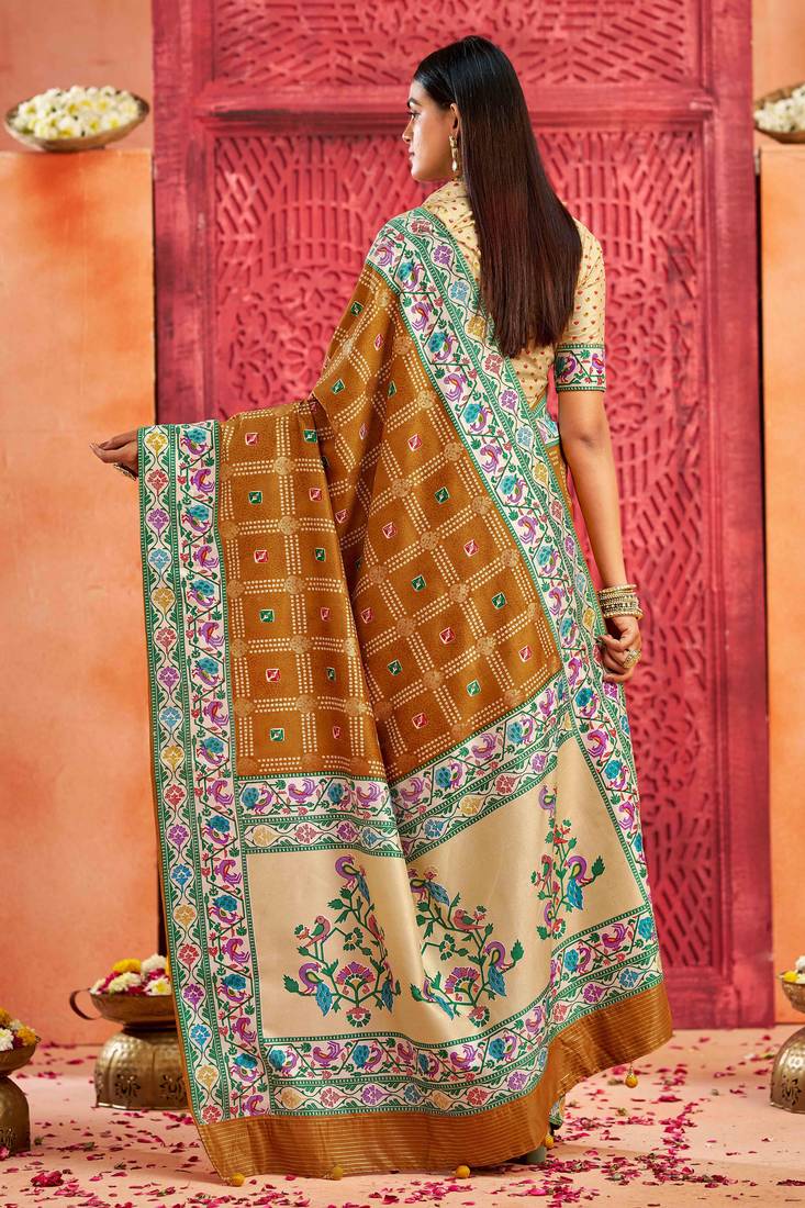 Mustard color velvet tussar silk blend fabric partywear saree with paithani pallu and traditional ghatchola print