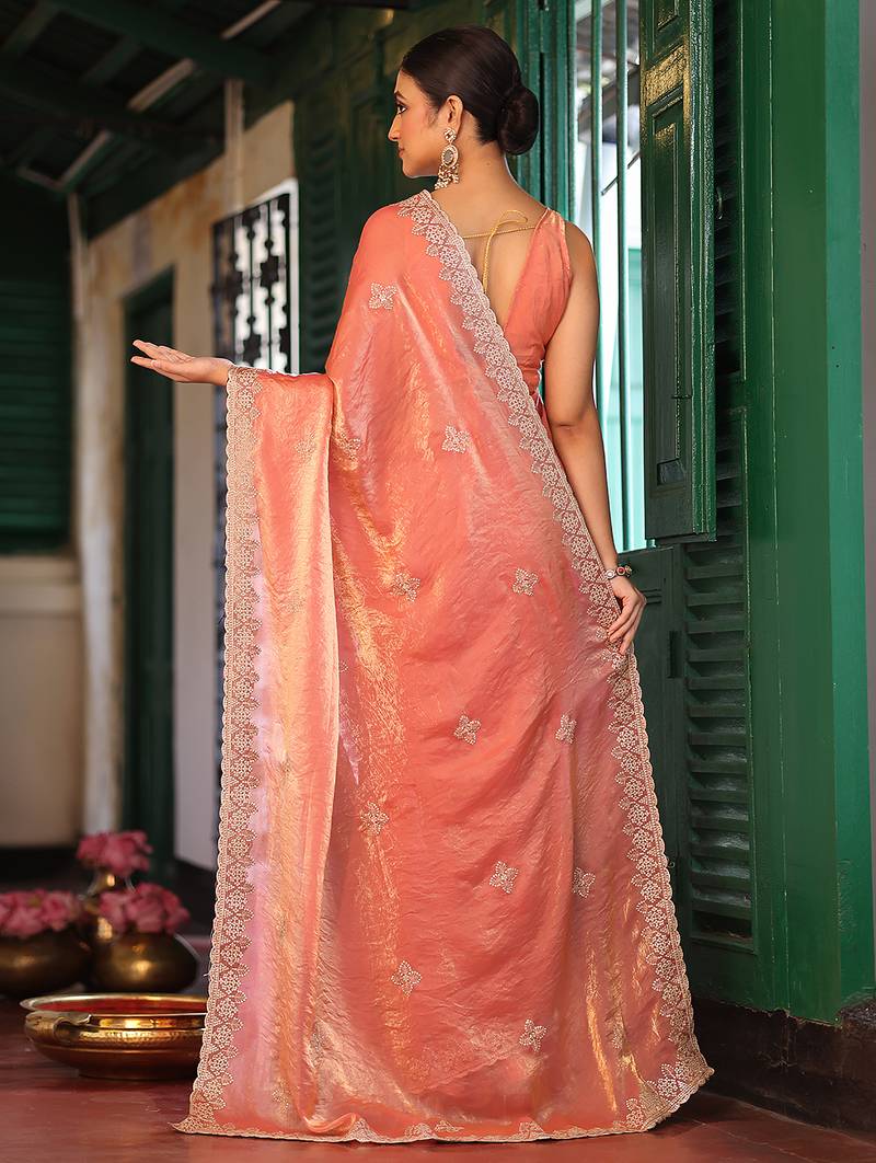 Orange color designer tissue fabric saree for ceremonial looks