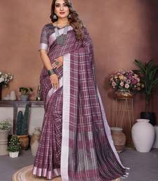 Purple color linen cotton fabric woven checks designer trendy ethnic saree