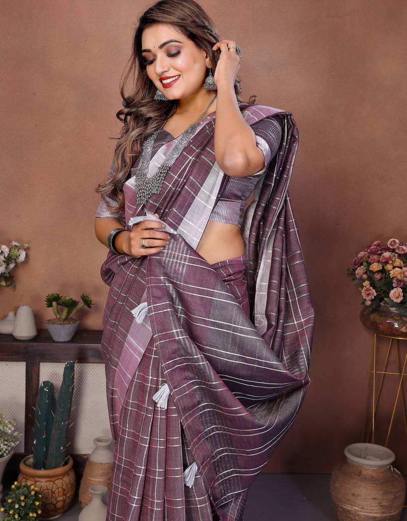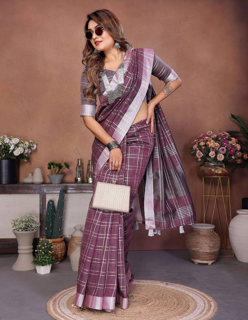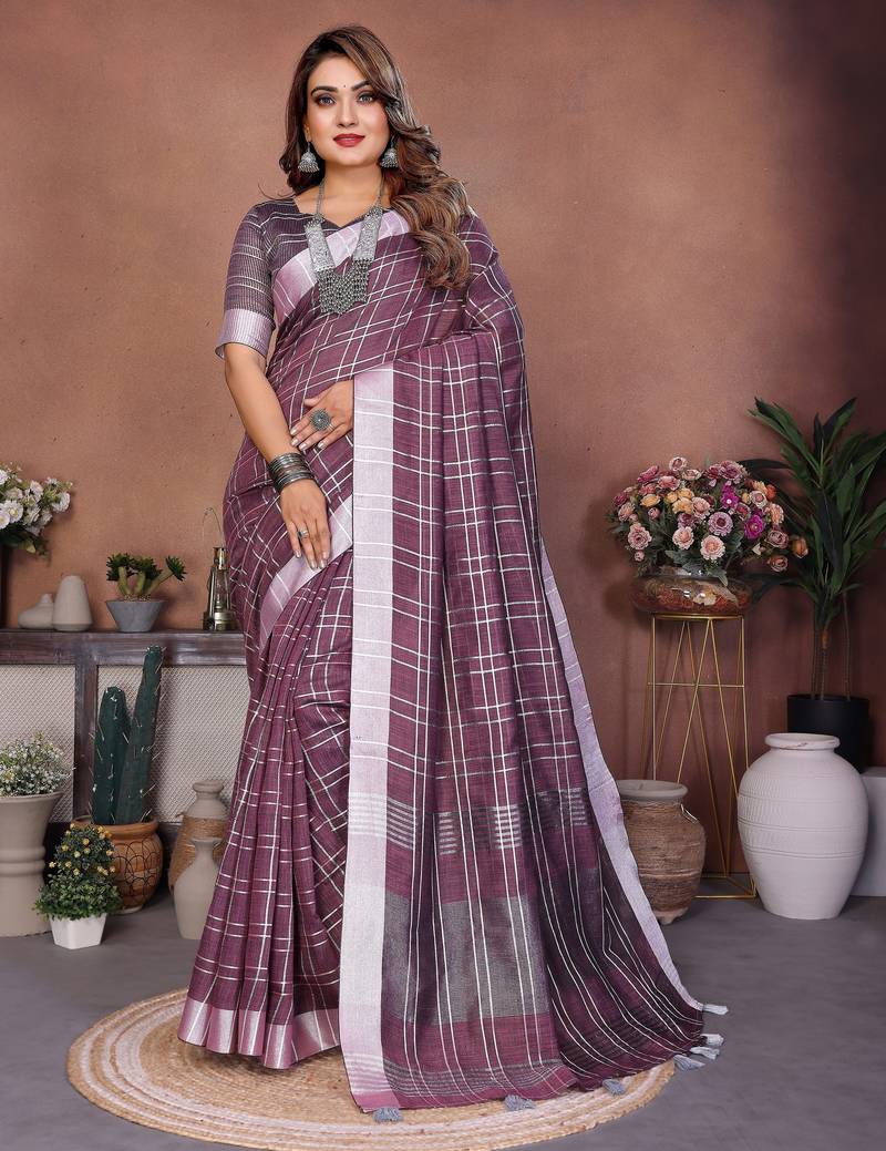 | Product Name | Purple Color Linen Cotton Fabric Woven Checks Designer Trendy Ethnic Saree | |