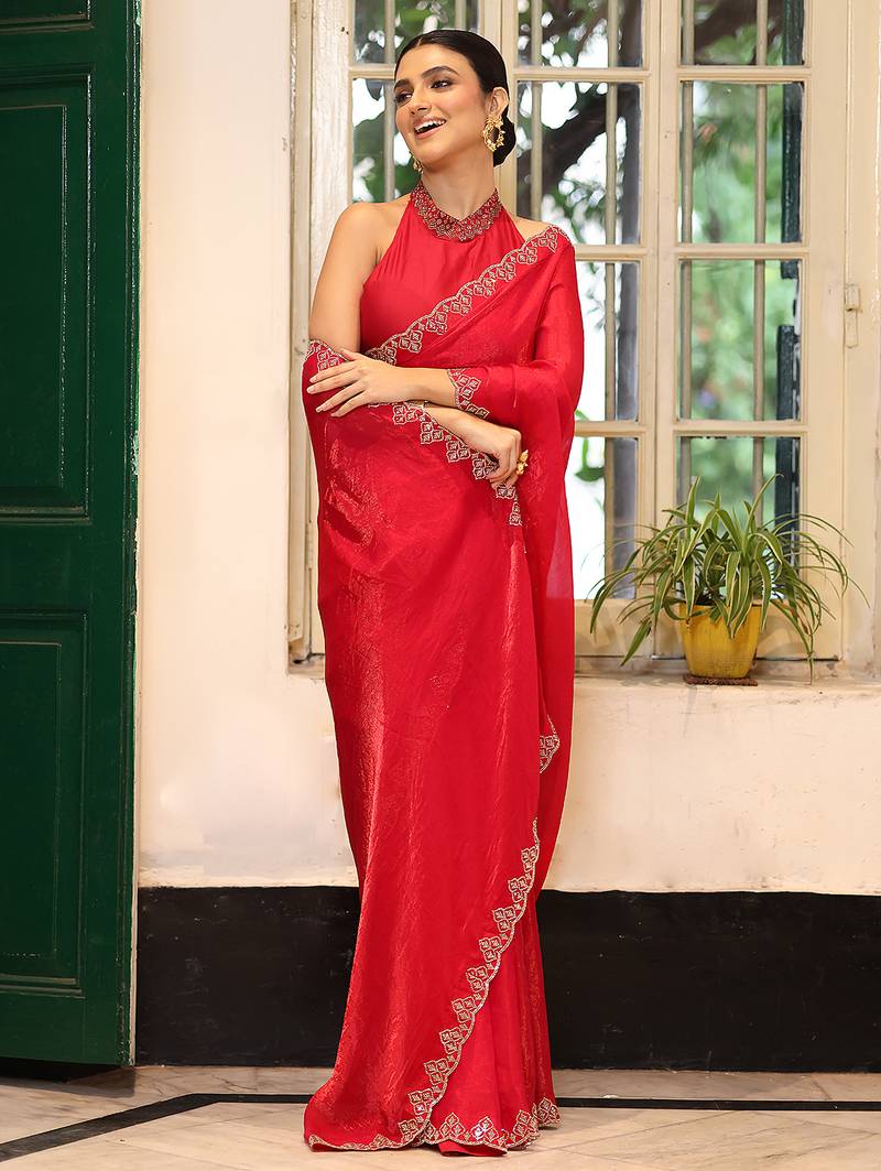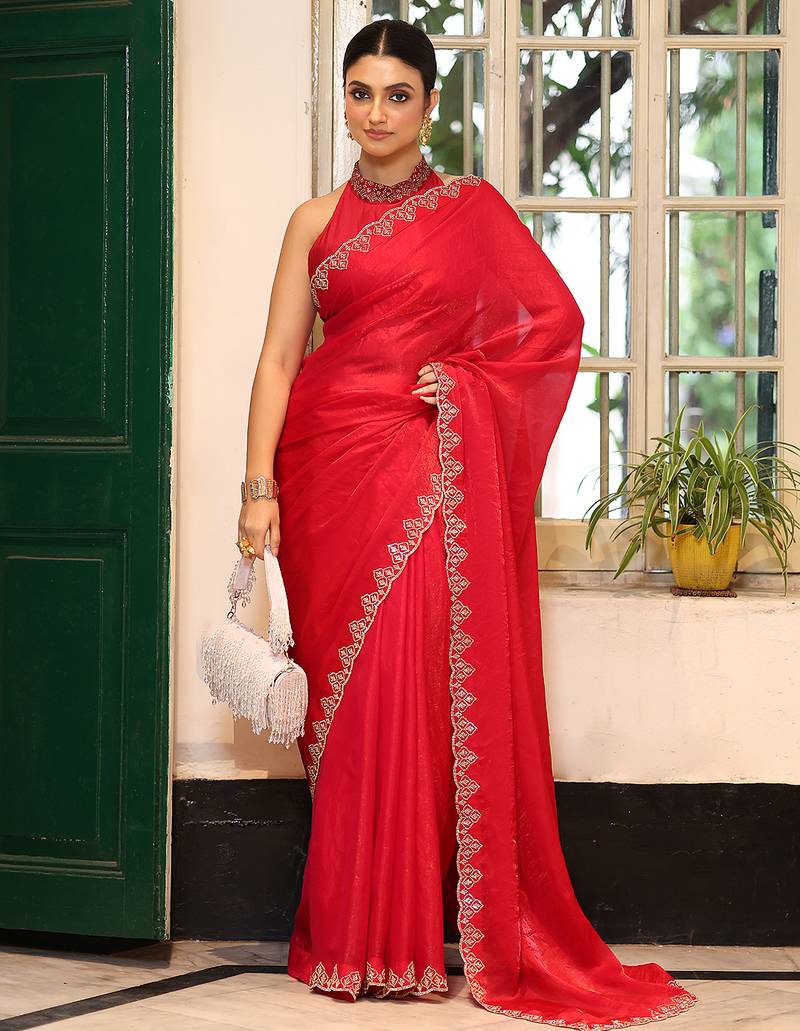 | • | Saree | : | Color- Red / Fabric- Faux Tissue |