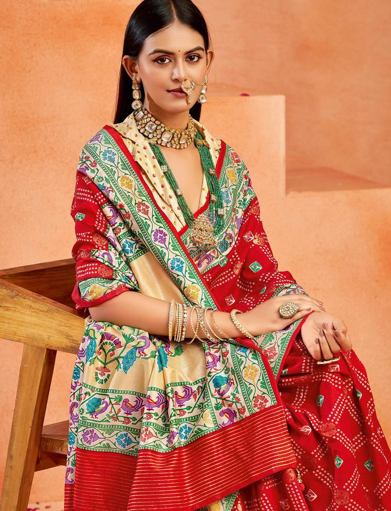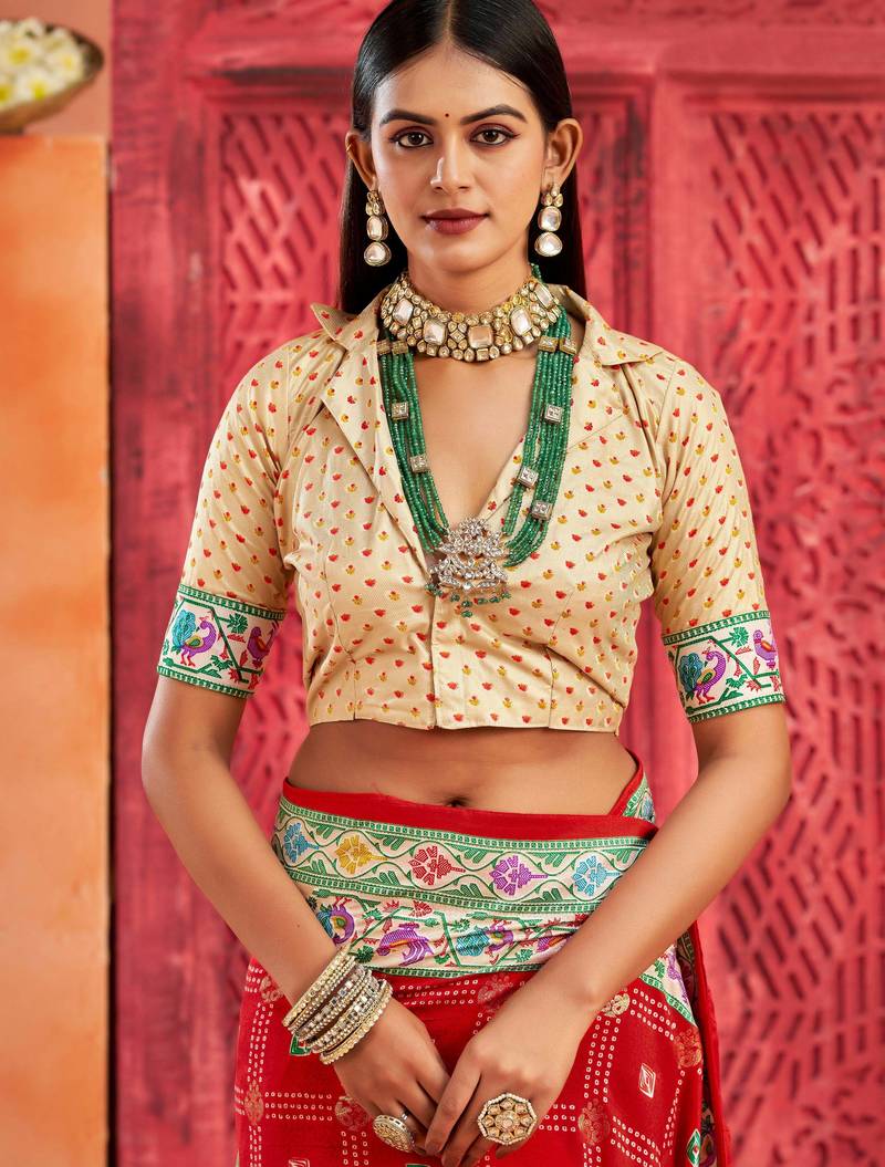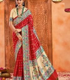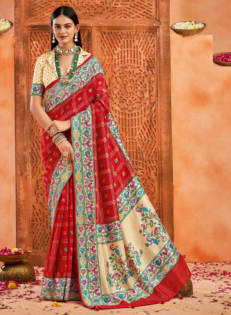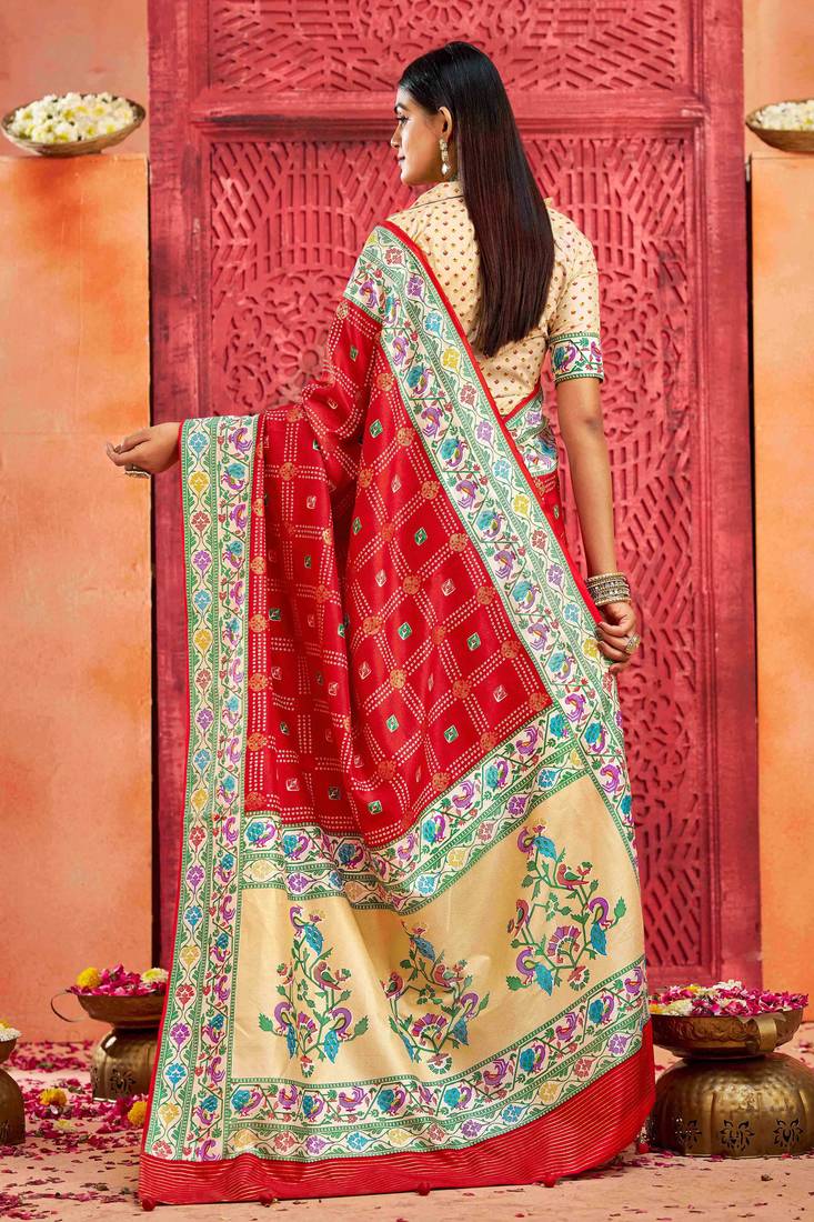 Red color velvet tussar silk blend fabric partywear saree with paithani pallu and traditional ghatchola print